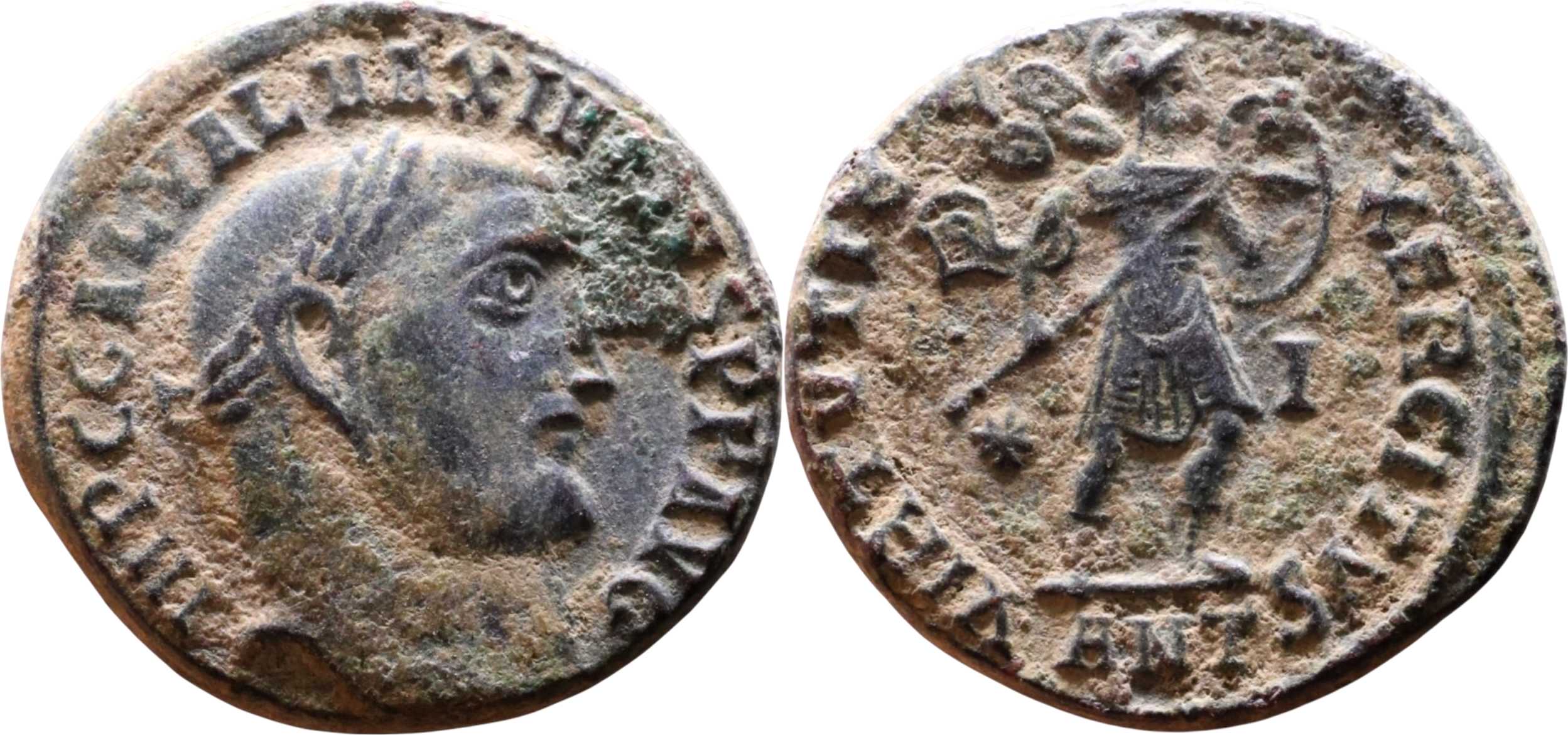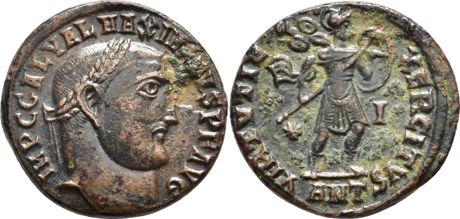 VIRTVTIE-XERCITVS [VIRTVTI EXERCITVS]; Virtus [actually Mars] advancing r., helmeted, in military dress, r. holding transverse spear, trophy over l. shoulder, shield on l. arm. Star in left field, I in right field. ANT in exergue.