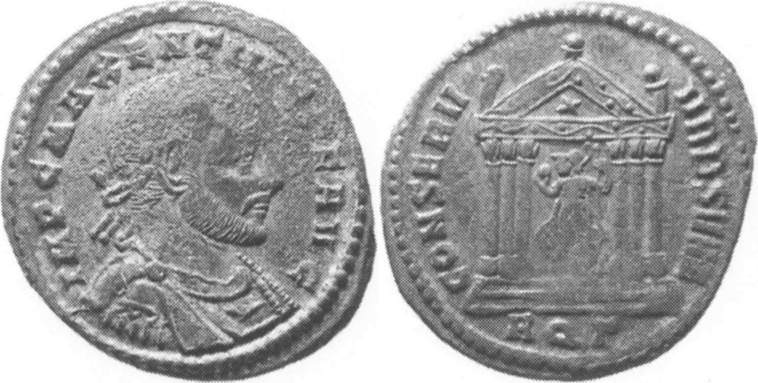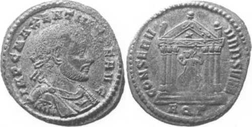 CONSERV-VRBSVAE [CONSERV VRB SVAE]; Roma seated facing, head l. in hexastyle temple, r. holding globe, l. sceptre; shield by side; knobs as acroteria; star in pediment. AQΓ in exergue.