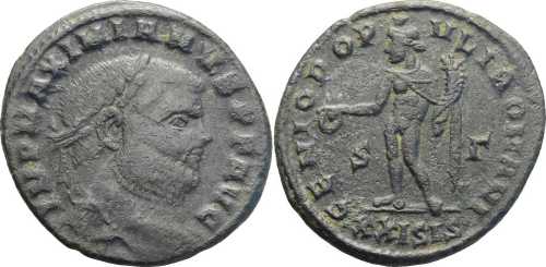 IMPMAXIMIANVSPFAVG [IMP MAXIMIANVS P F AVG]; head r., laur.