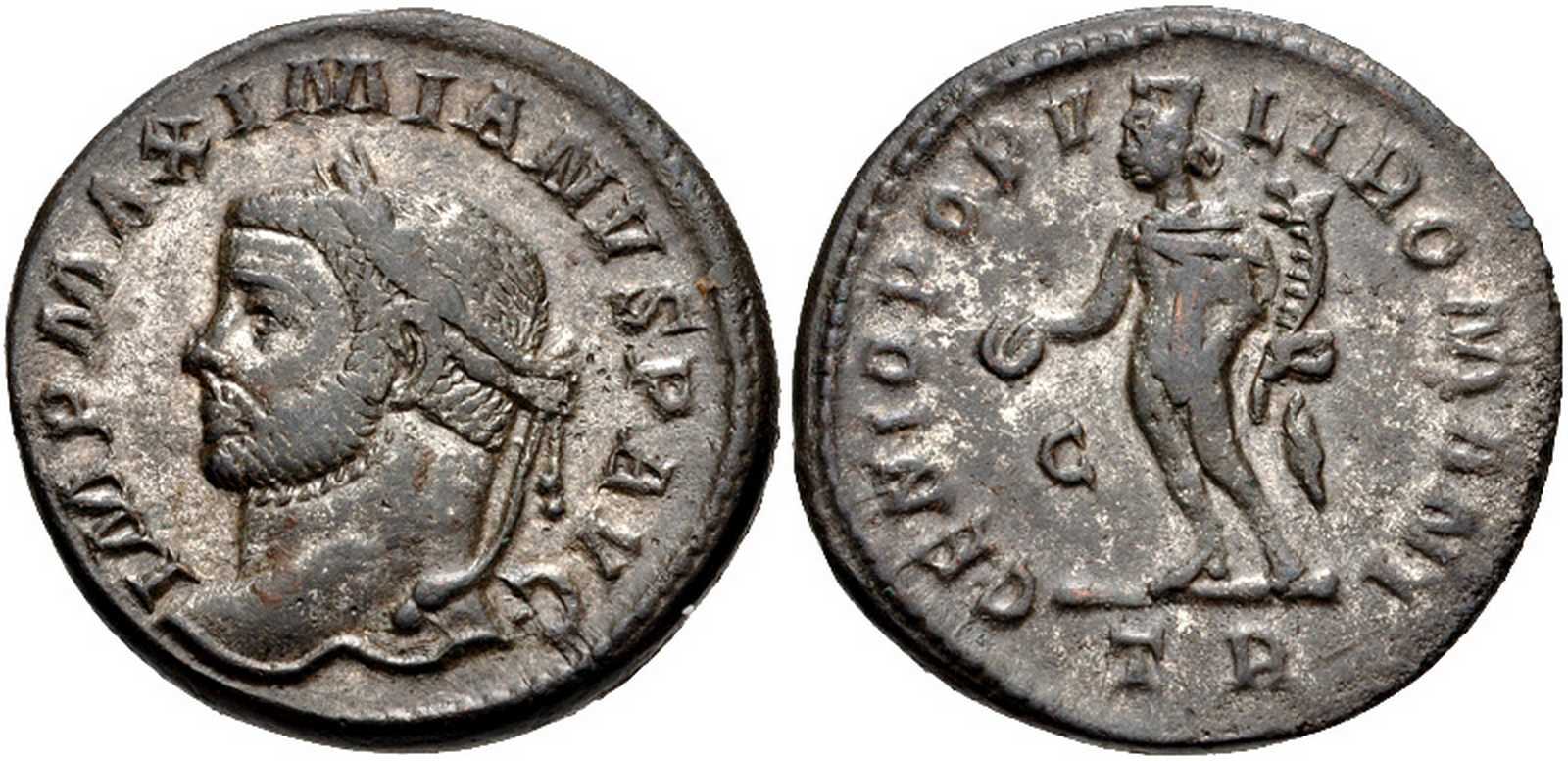 IMPMAXIMIANVSPAVG [IMP MAXIMIANVS P AVG]; head l., laur.