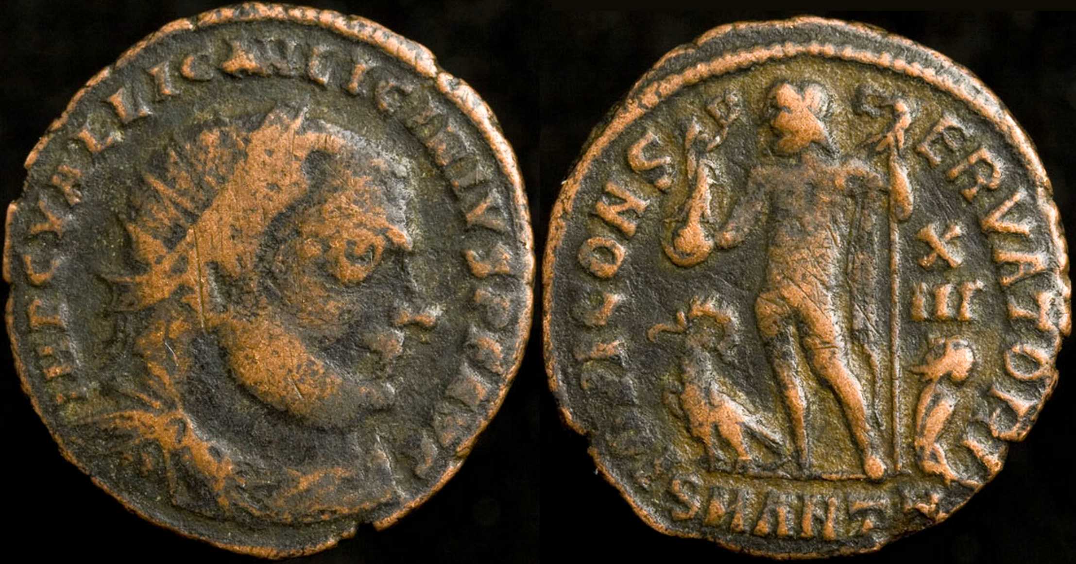 IOVICONS-ERVATORI [IOVI CONSERVATORI]; Jupiter stg. l., chlamys across l. shoulder, holding sceptre with eagle on top, Victory on globe in r. hand; eagle with wreath to l.; captive to r. on ground. X over II[half] in right field. SMANTZ in exergue.