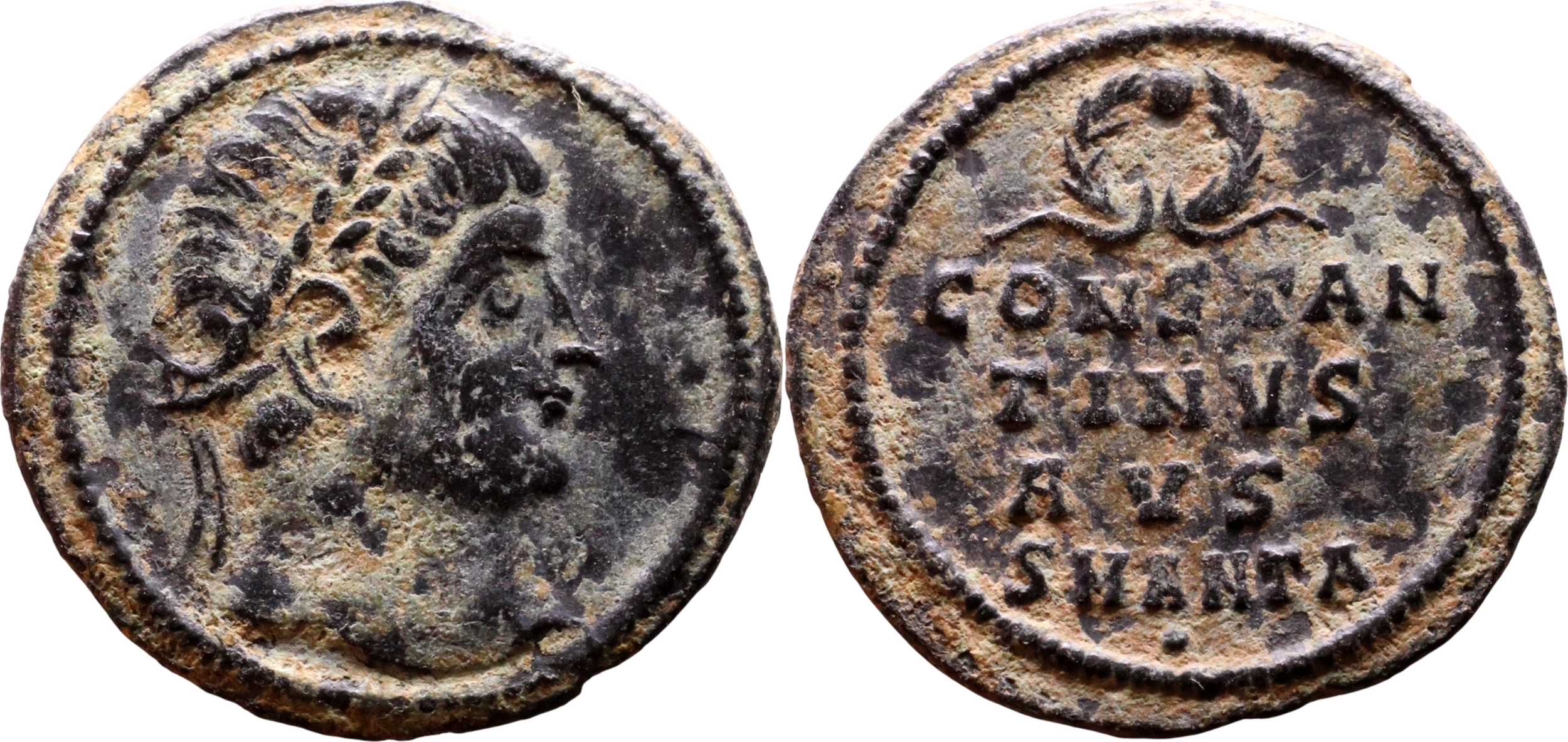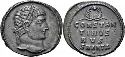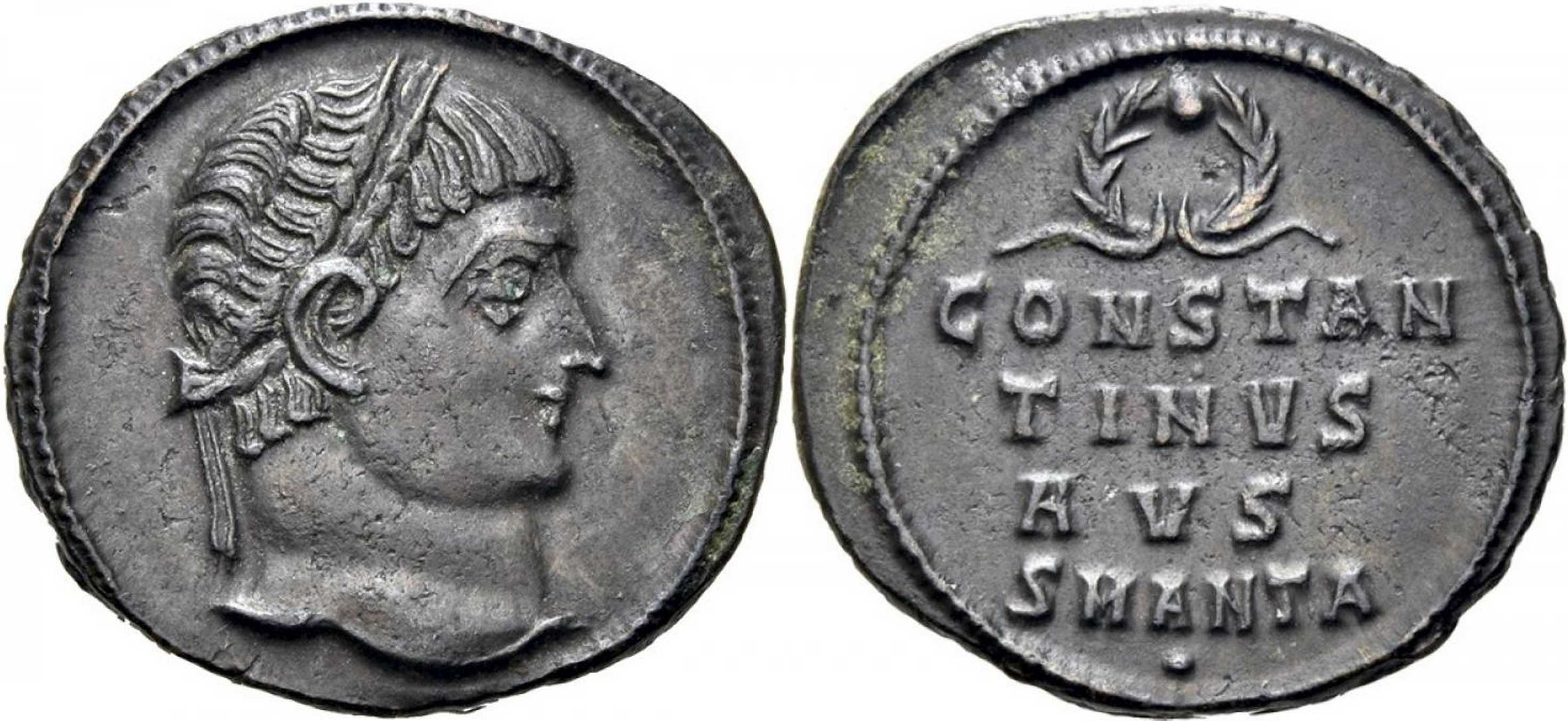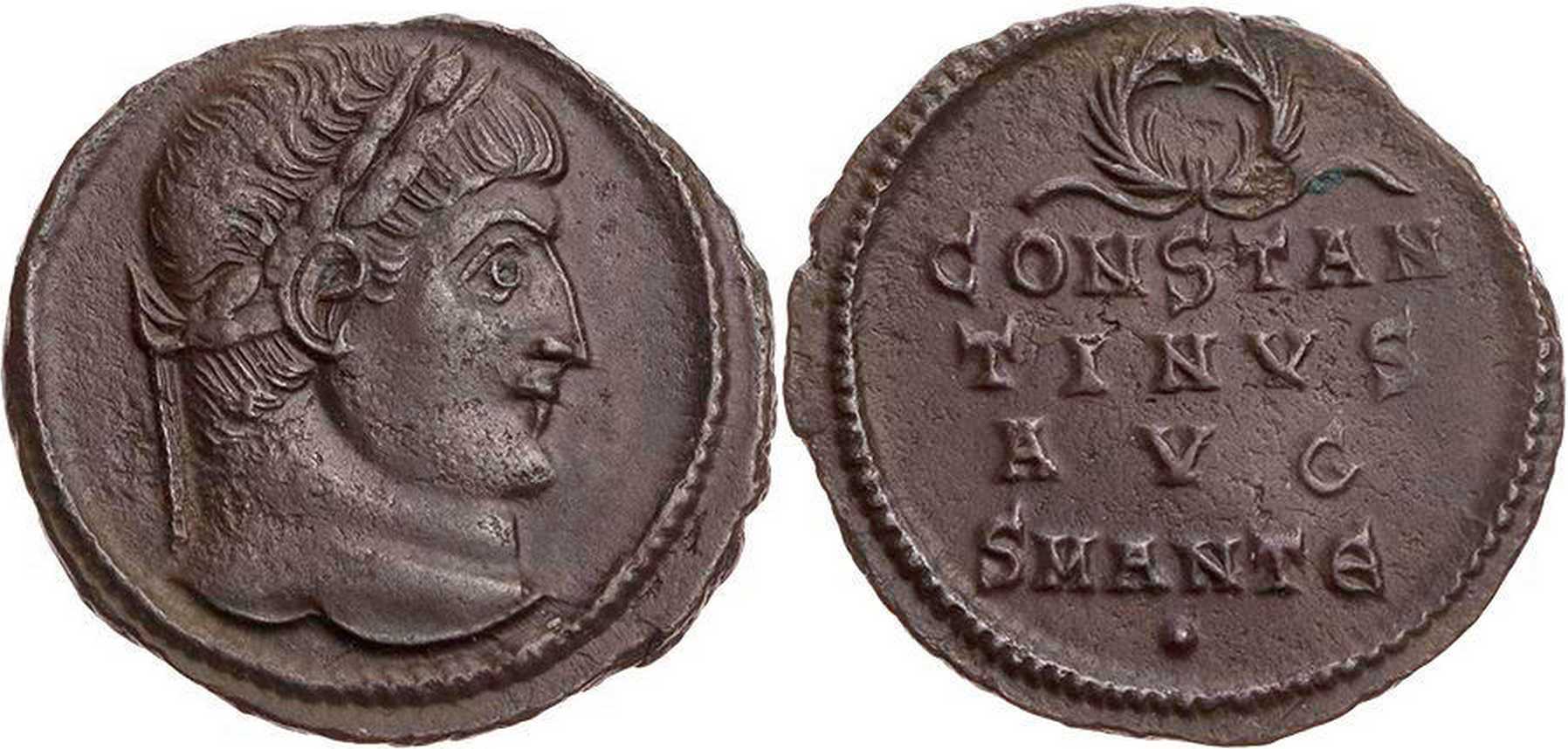 CONSTAN/TINVS/AVS (sic!) in three lines; wreath above. SMANTA in exergue. Dot under m.m.