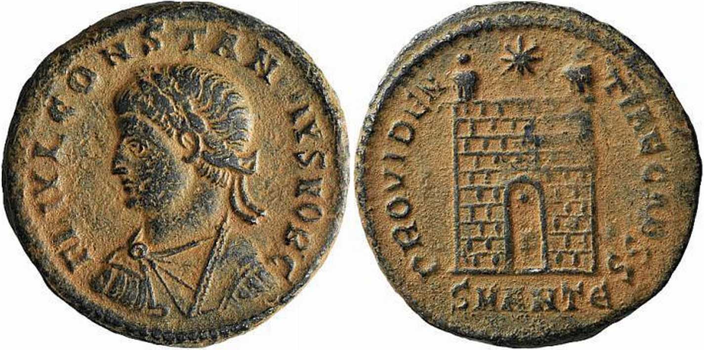 PROVIDEN-TIAECAESS [PROVIDENTIAE CAESS]; camp gate, two turrets, no doors, star above; varying number of stone layers. Dot in gateway. SMANTЄ in exergue.