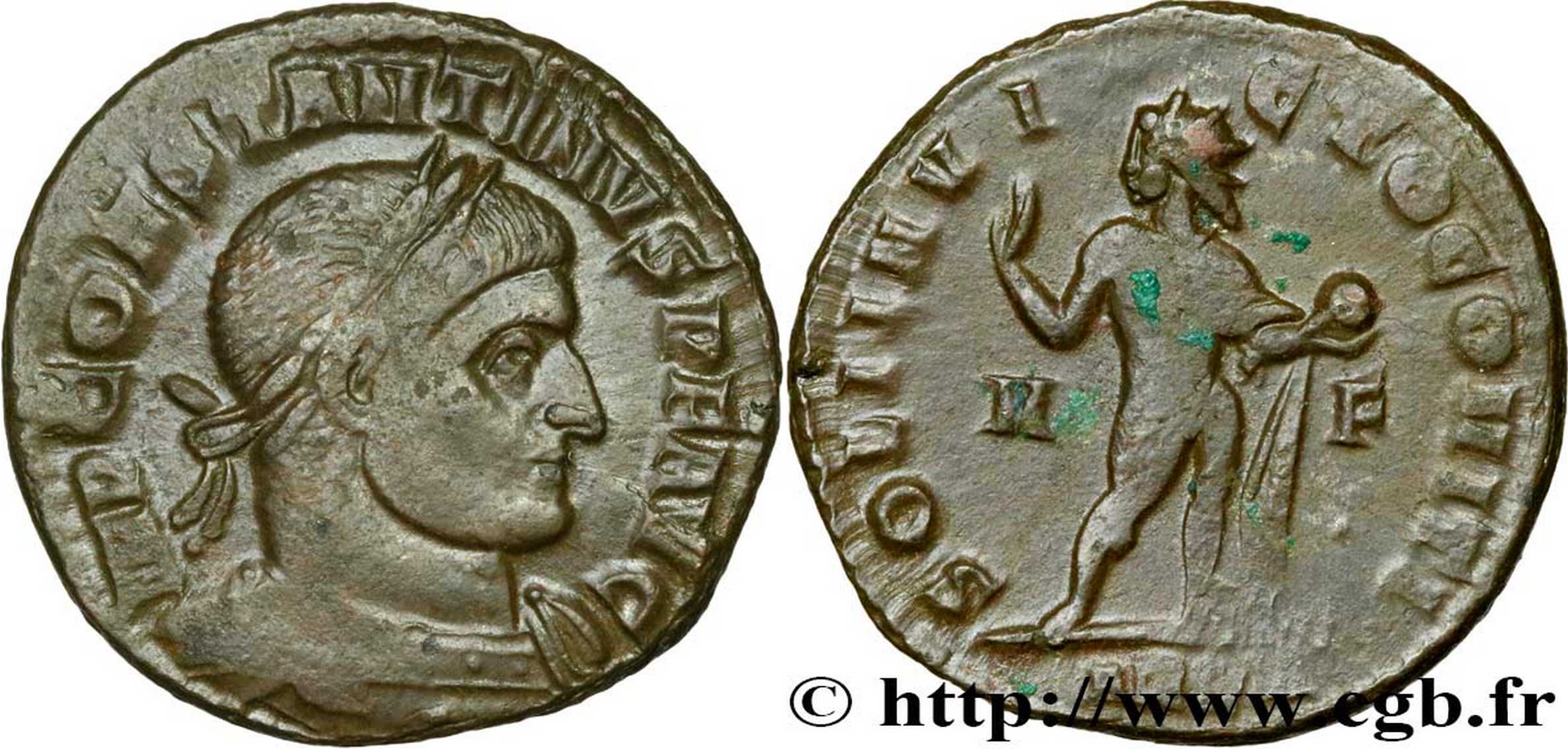 SOLIINV-I-CTOCOMITI [SOLI INVICTO COMITI]; Sol stg. r., looking l., chlamys across l. shoulder, globe in l. hand, raising r. M in left field, F in right field. ARLΔ in exergue.
