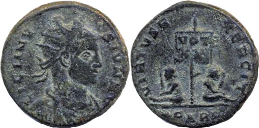 VIRTVSE-XERCIT [VIRTVS EXERCIT]; military standard with drapery marked VOT/XX; on either side, captive std. on ground. PARL in exergue.