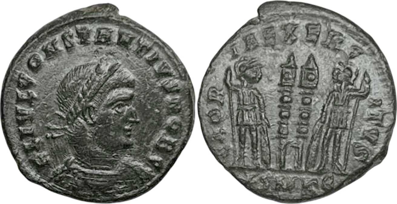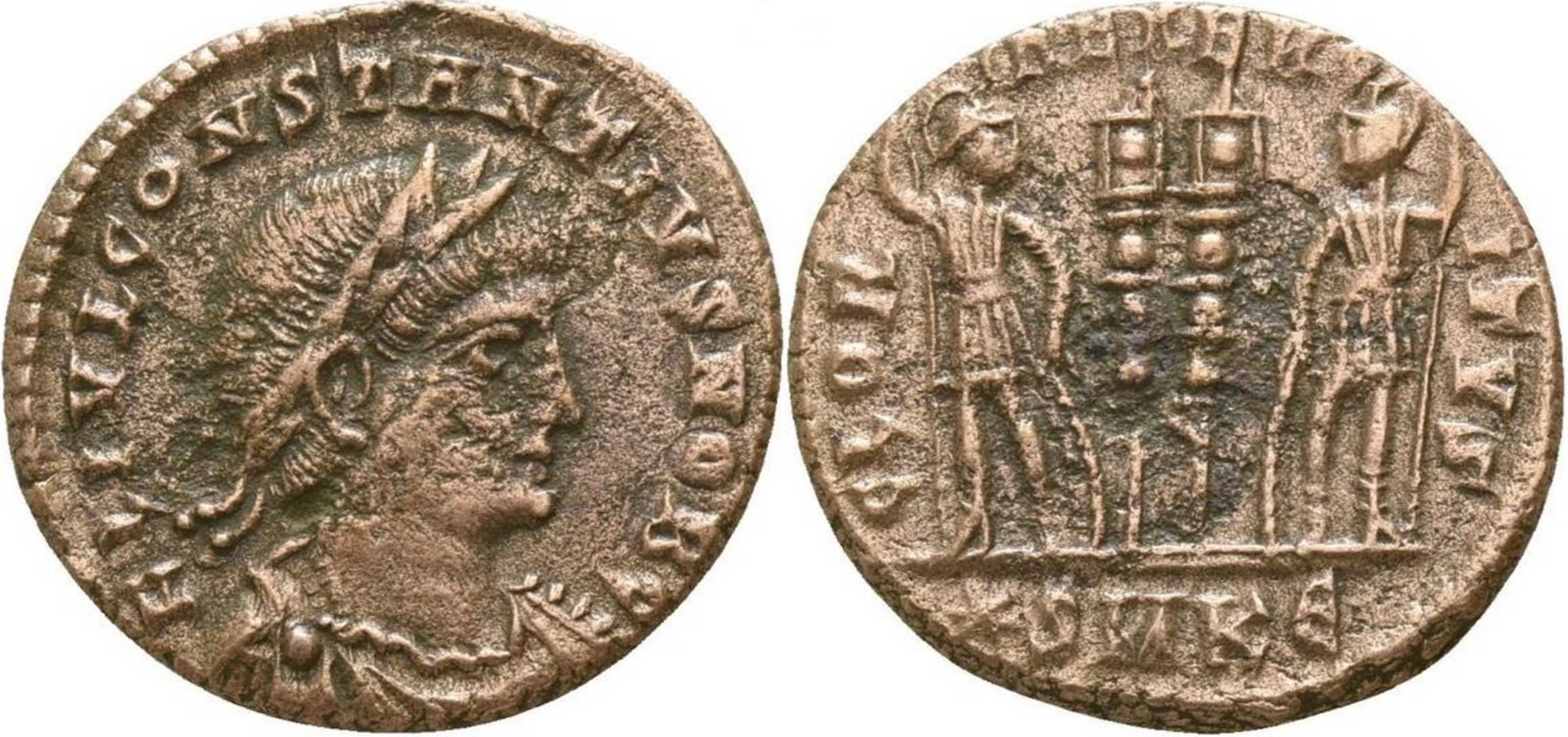 FLIVLCONSTANTIVSNOBC [FL IVL CONSTANTIVS NOB C]; bust r., laur., dr., cuir.
