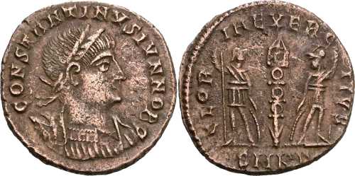 CONSTANTINVSIVNNOBC [CONSTANTINVS IVN NOB C]; bust r., laur., cuir.