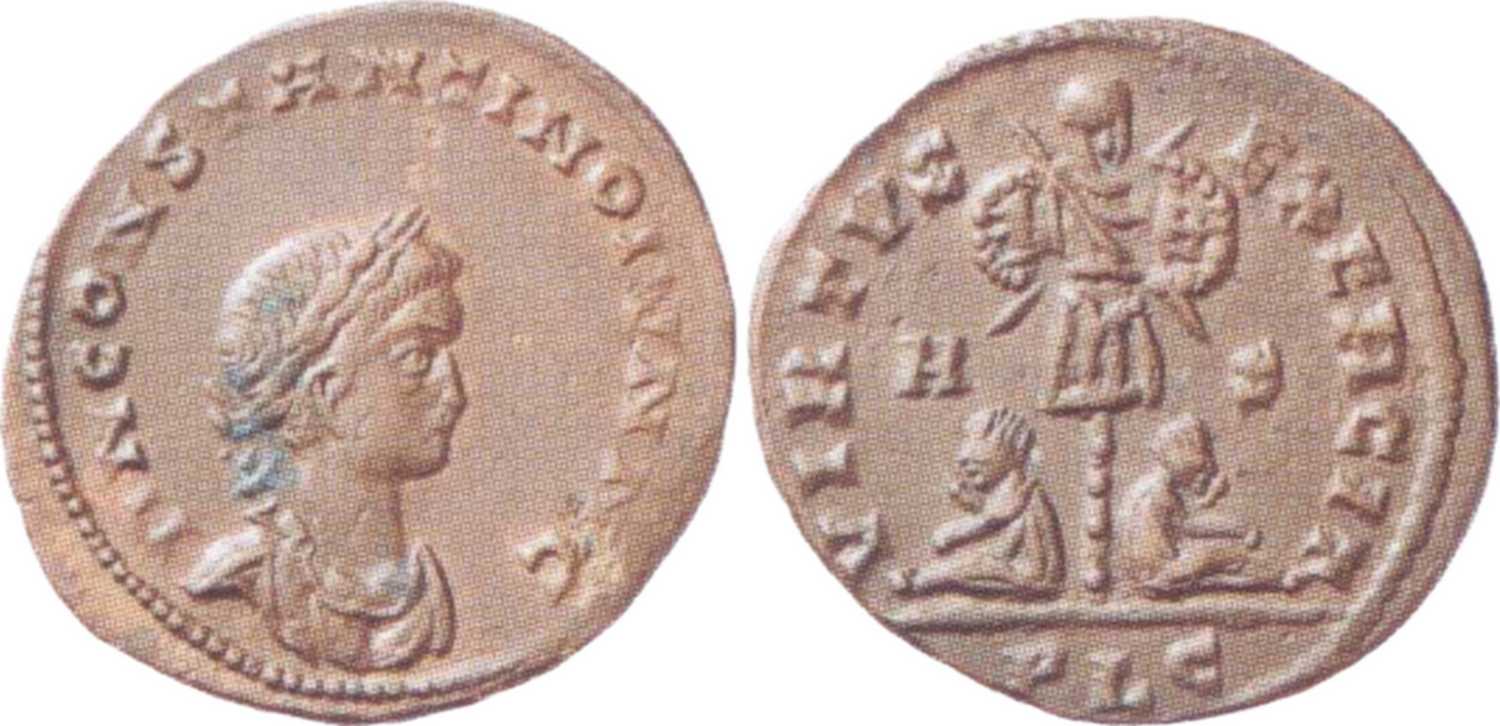 DNCONSTANTINOIVNNC [D N CONSTANTINO IVN N C]; bust r., laur., dr., cuir. [B4].