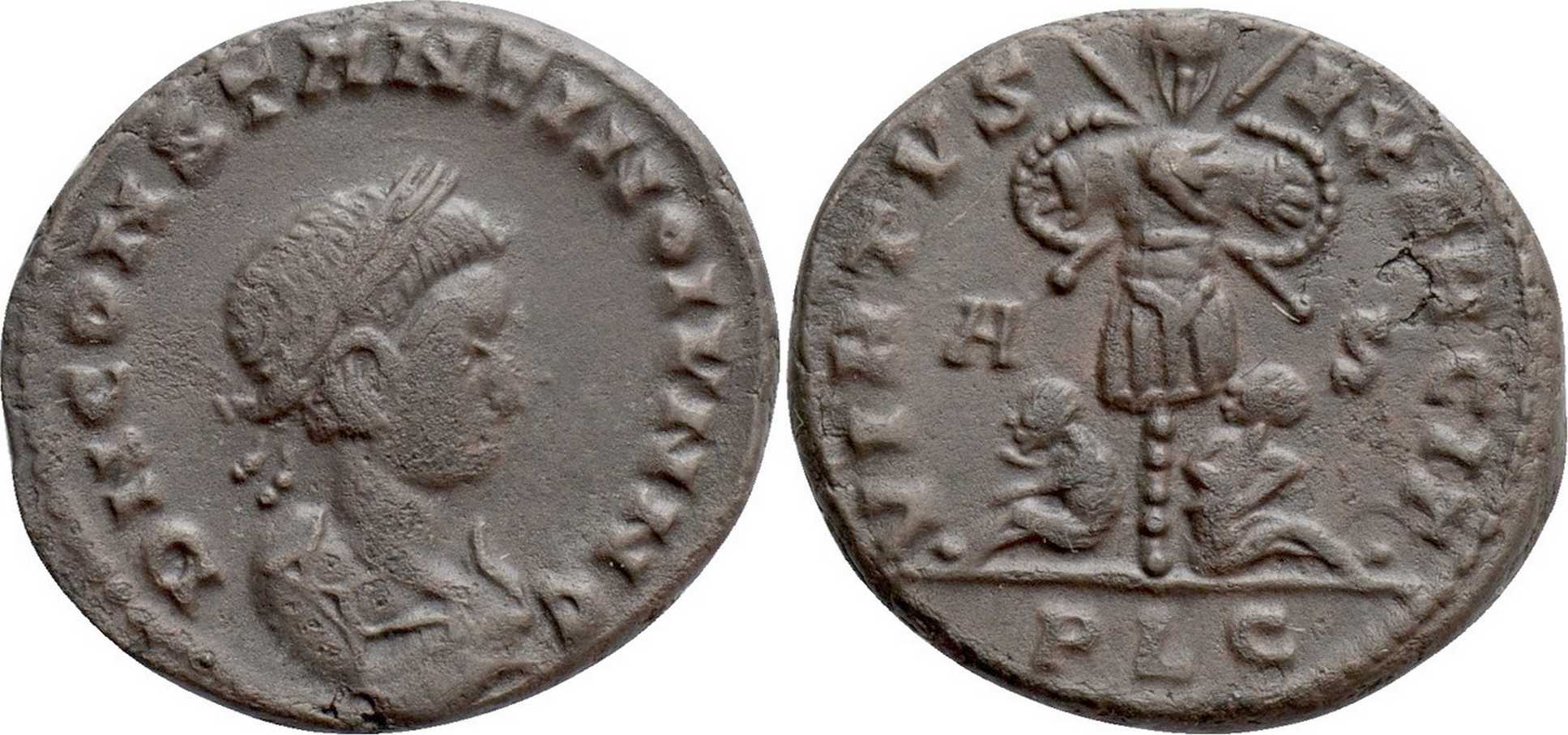 UNLISTED BUST TYPE - B4. Not attested for obv. legend 7 (p. 129). Note that LYONS 105 (Numismatik Naumann 118, lot 972, 3.37 g, 19 mm) with bust B3 also exists. Listed in Collezione Sabetta (p. 126, no. 25). Listed in Bastien Lyon (318-337) (p. 145, no. 46; the same coin). Coin should be listed in RIC after LYONS 105.