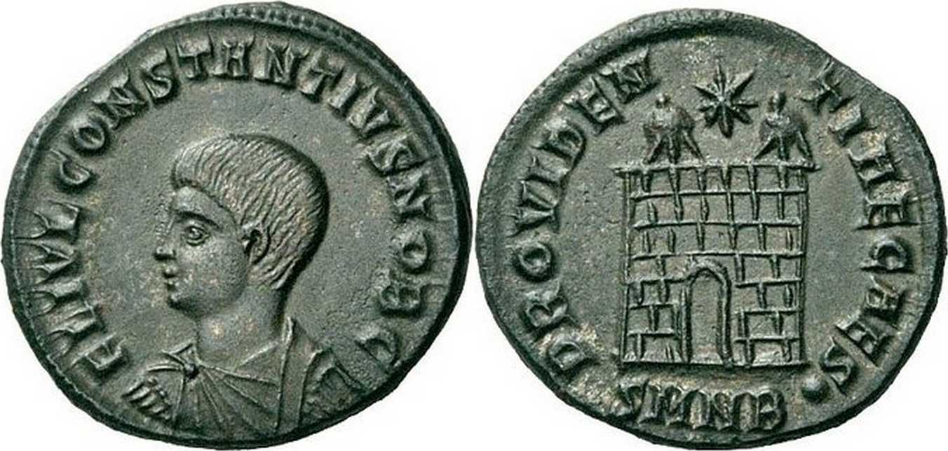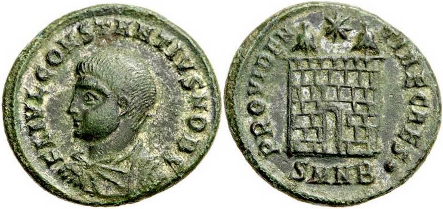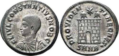 PROVIDEN-TIAECAES [PROVIDENTIAE CAES]; camp gate, two turrets, no doors, star above, varying number of stone layers. SMNB in exergue.