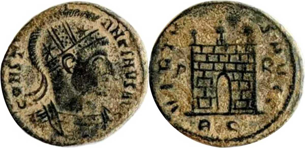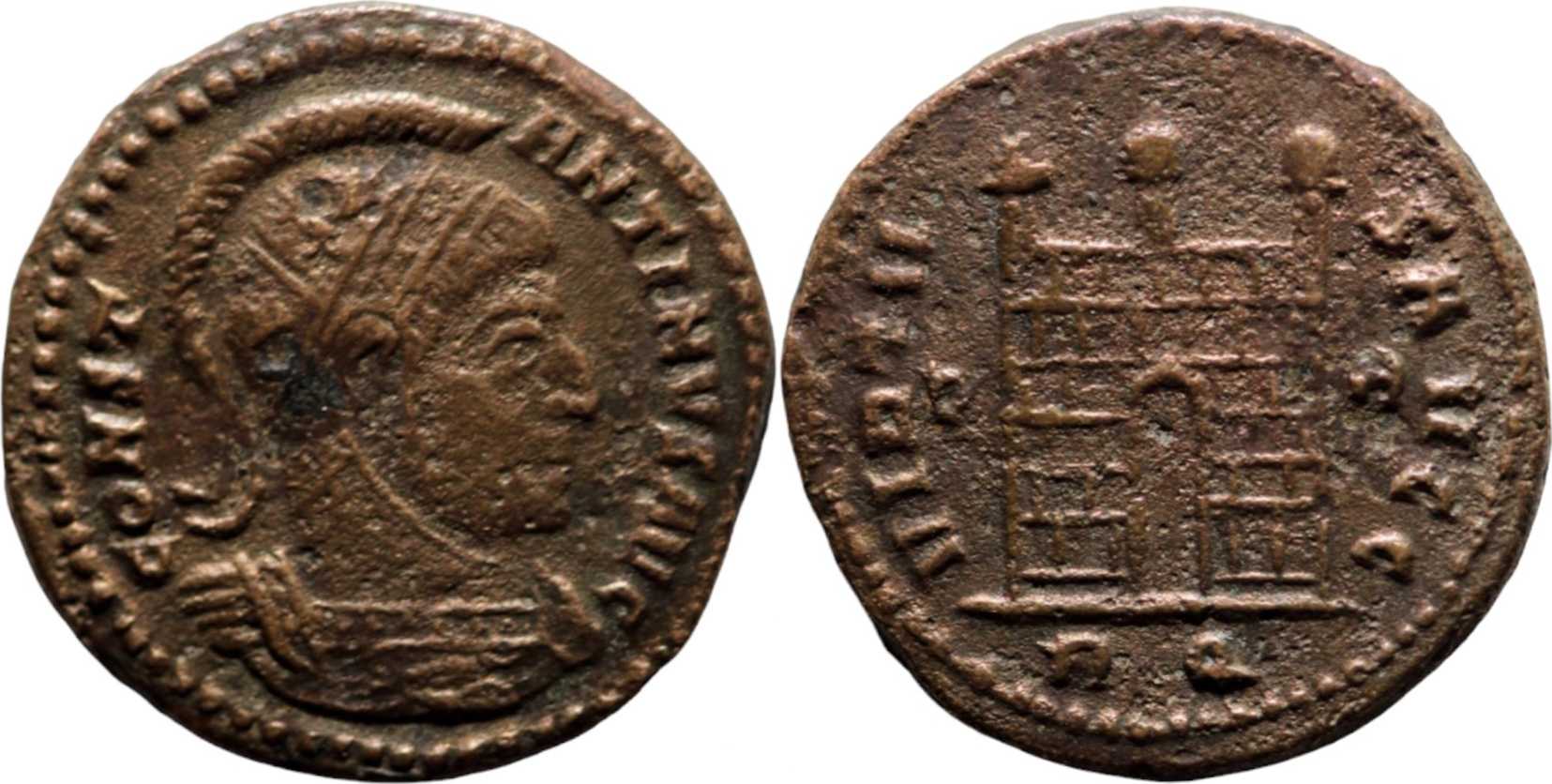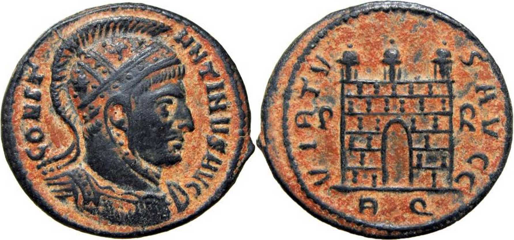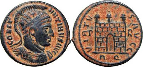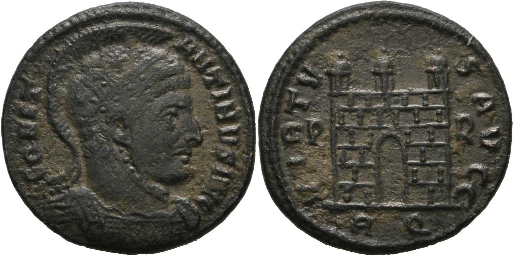 UNLISTED OFFICINA - Q. RIC lists only officinae S and T (p. 315). Note that bowl-shaped helmet with long crest is also attested for off. T (cf. footnote 167 on p. 315). For varieties of Constantine's helmets from ROME 143-193 emission see CORRIGENDA, VOL. VII, p. 348.