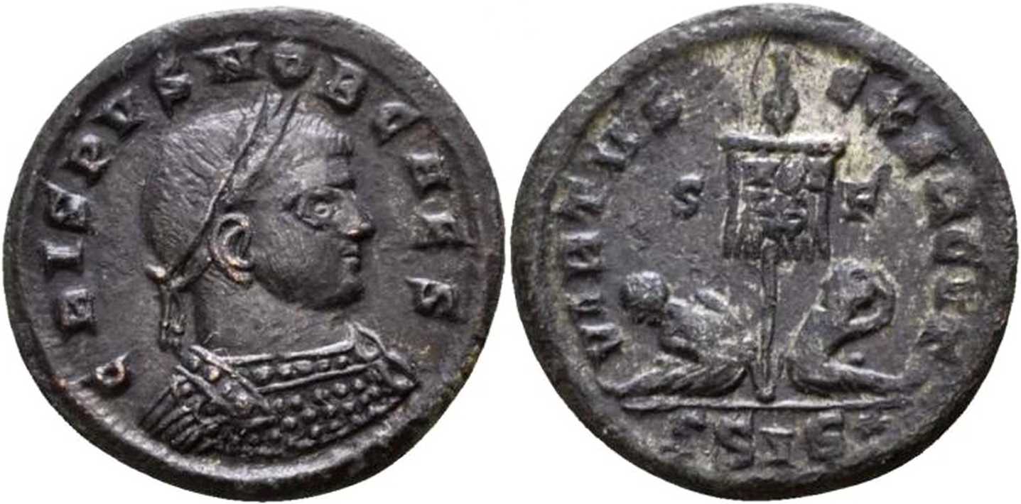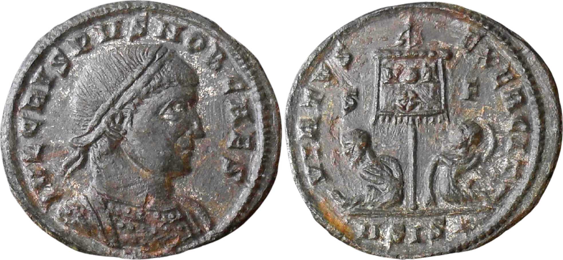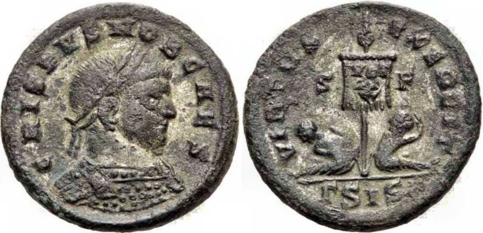 VIRTVS-EXERCIT [VIRTVS EXERCIT]; standard inscribed VOT/X, captive std. on ground on either side. S in left field, F in right field. ΓSIS* in exergue.