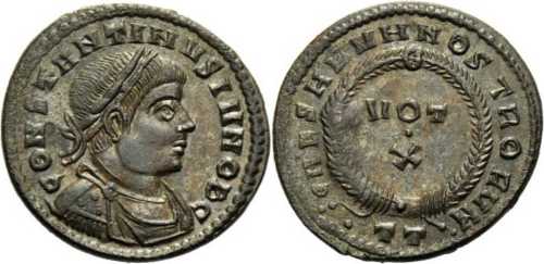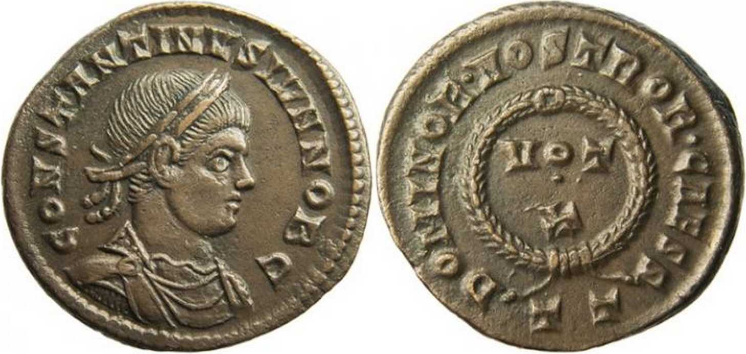 CONSTANTINVSIVNOBC [CONSTANTINVS IVN OB (sic!) C]; bust r., laur., dr., cuir.