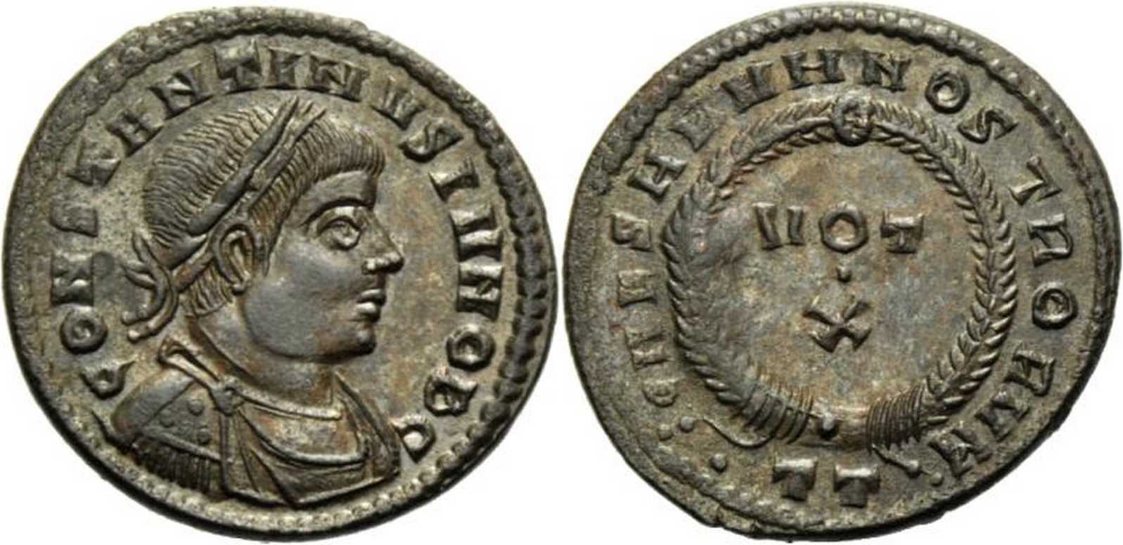 CAESARVMNOSTRORVM [CAESARVM NOSTRORVM]; laurel wreath enclosing VOT/X. TT in exergue.