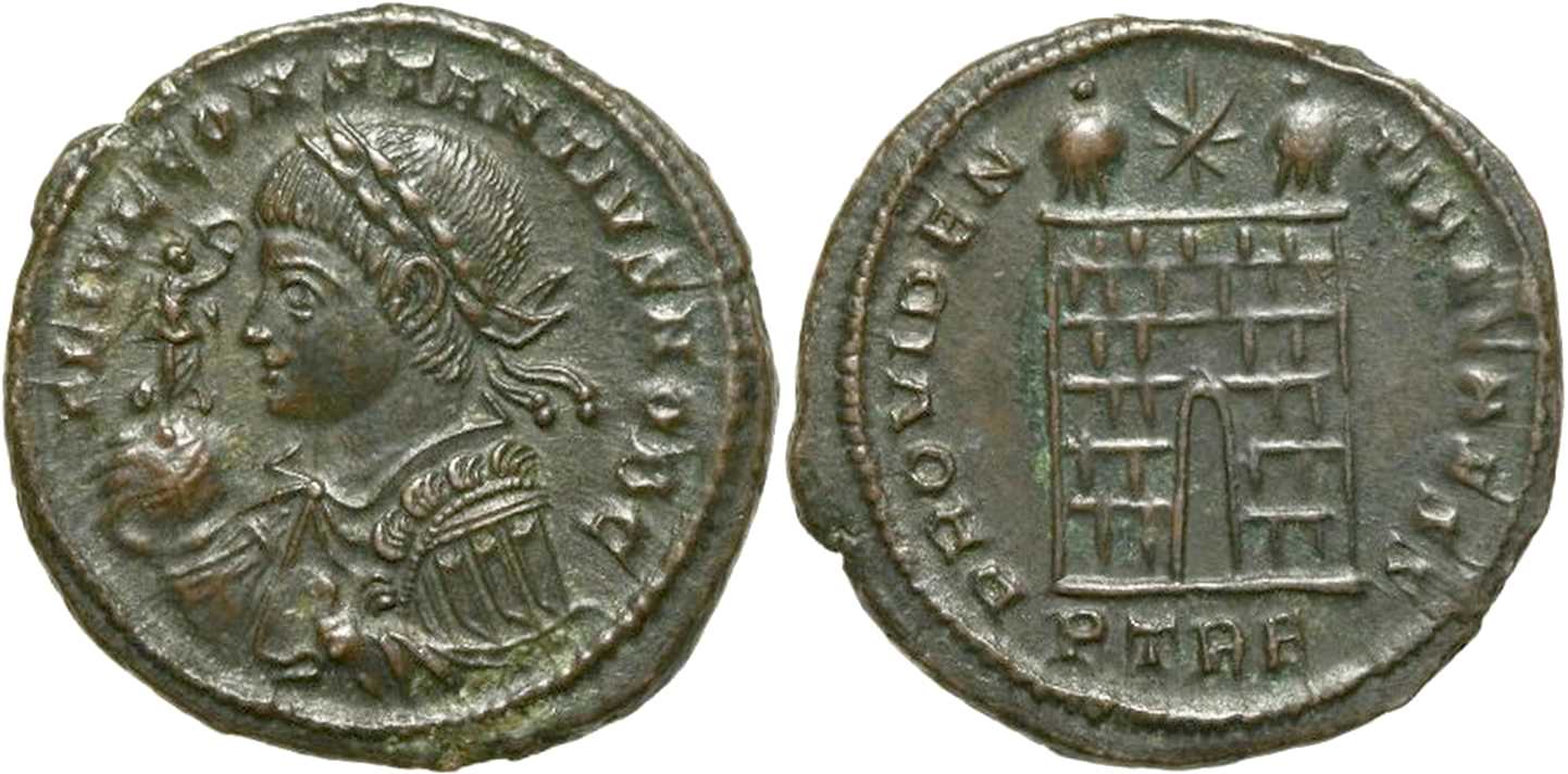 PROVIDEN-TIAECAESS [PROVIDENTIAE CAESS]; camp gate with two turrets, no doors, star above. PTRE in exergue.