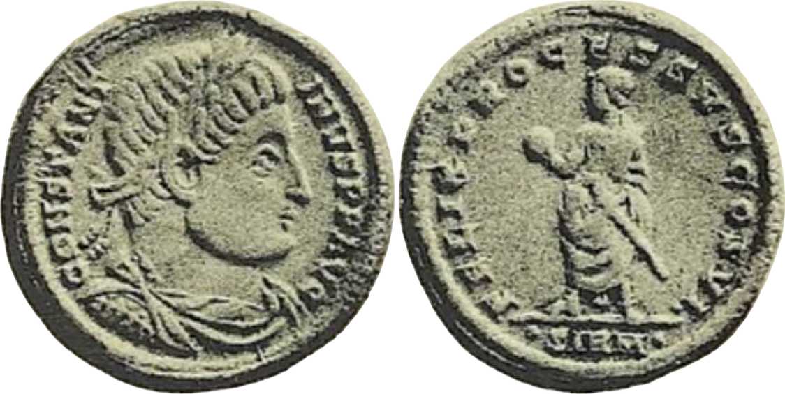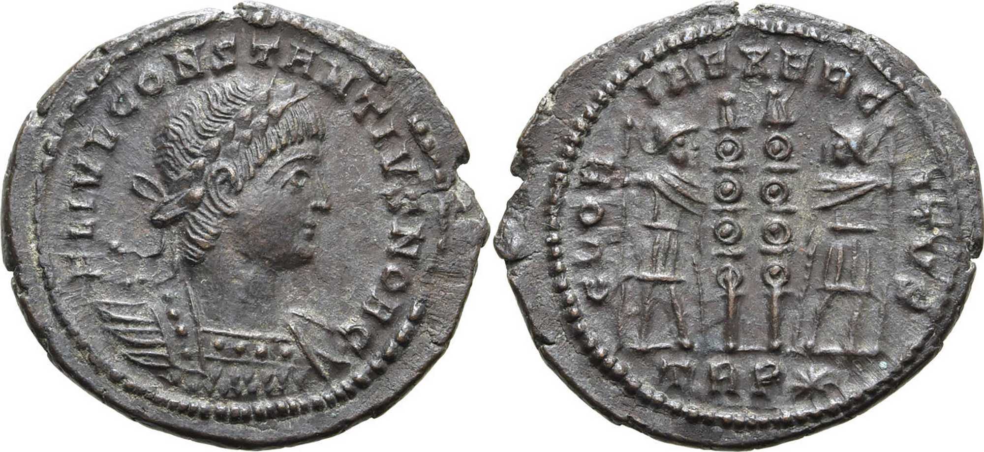 The present author agrees that this correction is somehow justified but is inclined to retain the old description for LONDON 255 ("bust rad., dr., cuir."; example from Via-Agrippa, 3.50 g, 19 mm). However, there is a similar and much more confusing case with LONDON 257 ("bust rad., cuir."). Some specimens may be described as cuirassed and some as trabeate. See examples of LONDON 257, bust cuirassed and LONDON [after 259], bust trabeate. The last type is also often confused with LONDON 255.