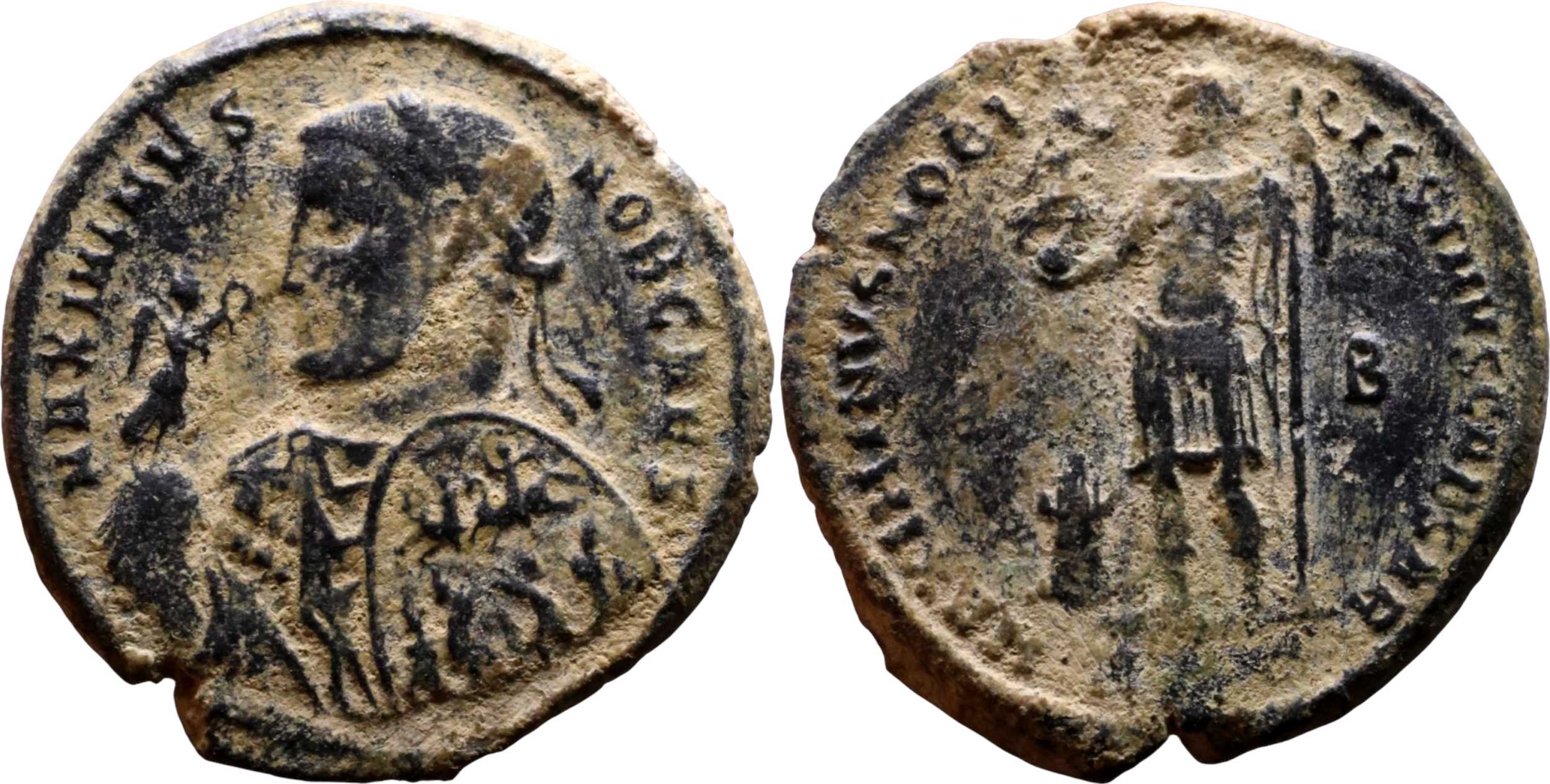 MAXIMINVSNOBI-LISSIMVSCAESAR [MAXIMINVS NOBILISSIMVS CAESAR]; Maximinus stg. facing, head l., in military dress, r. holding Victory on globe, l. leaning on spear. Altar in left field, B in right field. ANT in exergue.