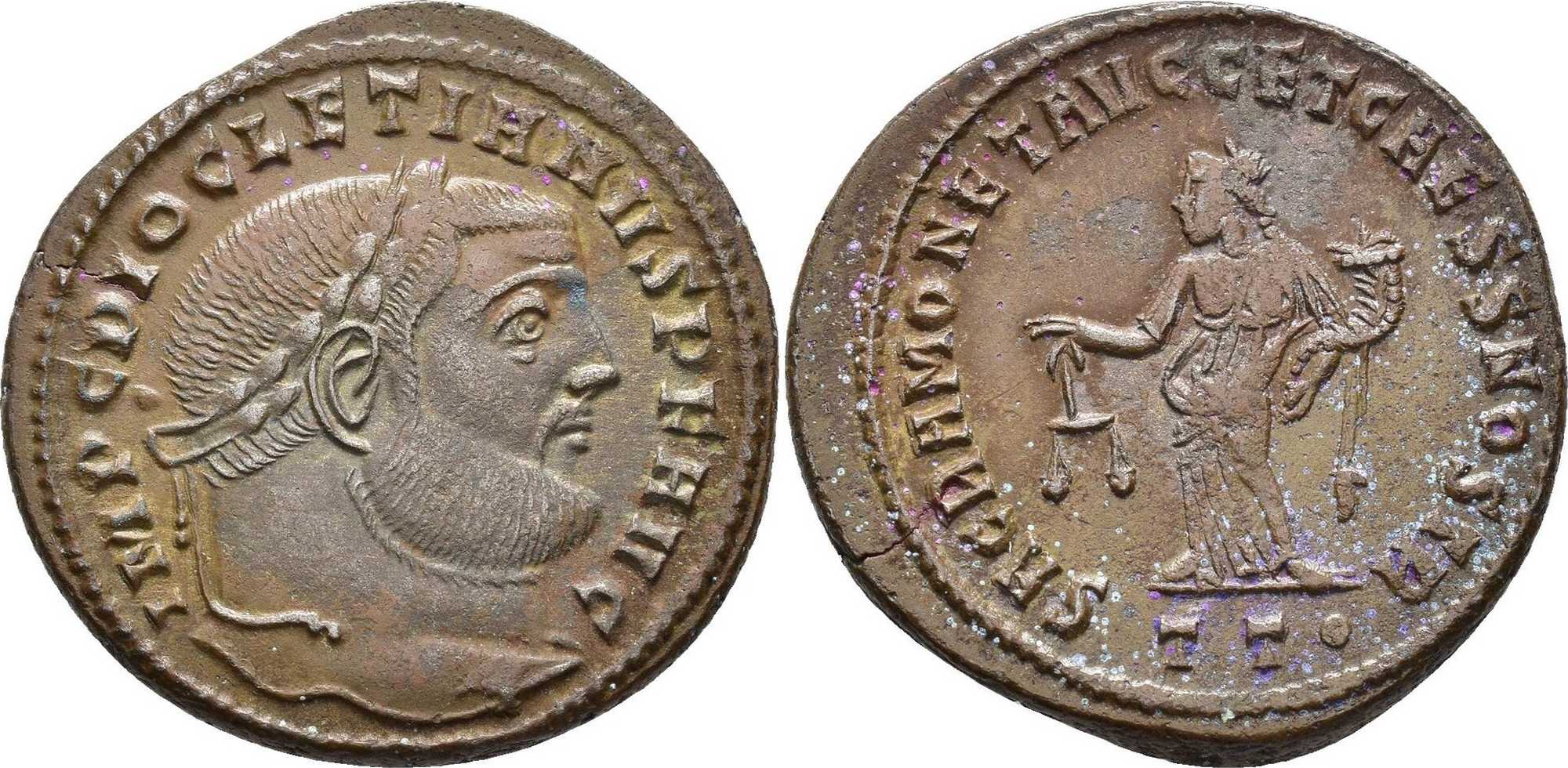 SACRAMONETAVGGETCAESSNOSTR [SACRA MONET AVGG ET CAESS NOSTR]; Moneta stg. l., r. holding scales, l, cornucopiae. TT in exergue.