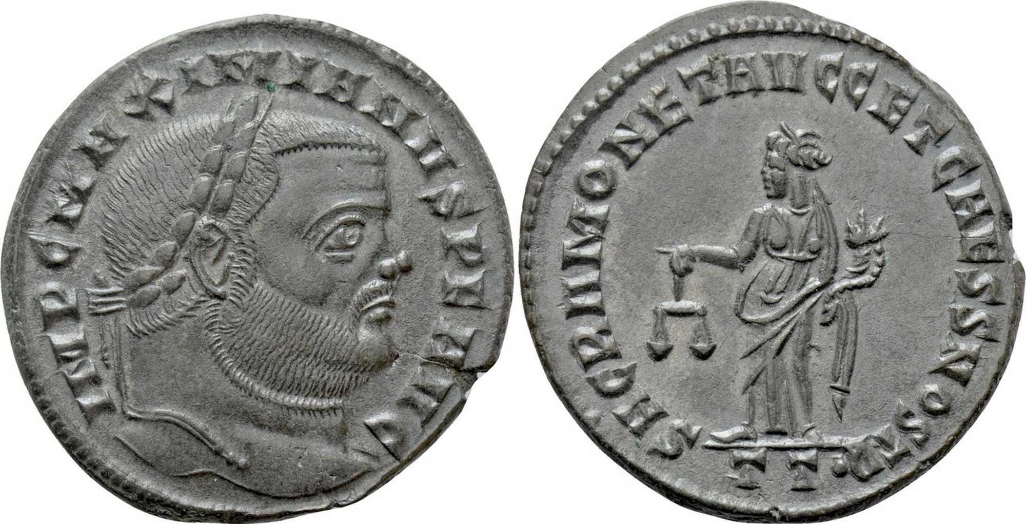 SACRAMONETAVGGETCAESSNOSTR [SACRA MONET AVGG ET CAESS NOSTR]; Moneta stg. l., r. holding scales, l, cornucopiae. TT in exergue.