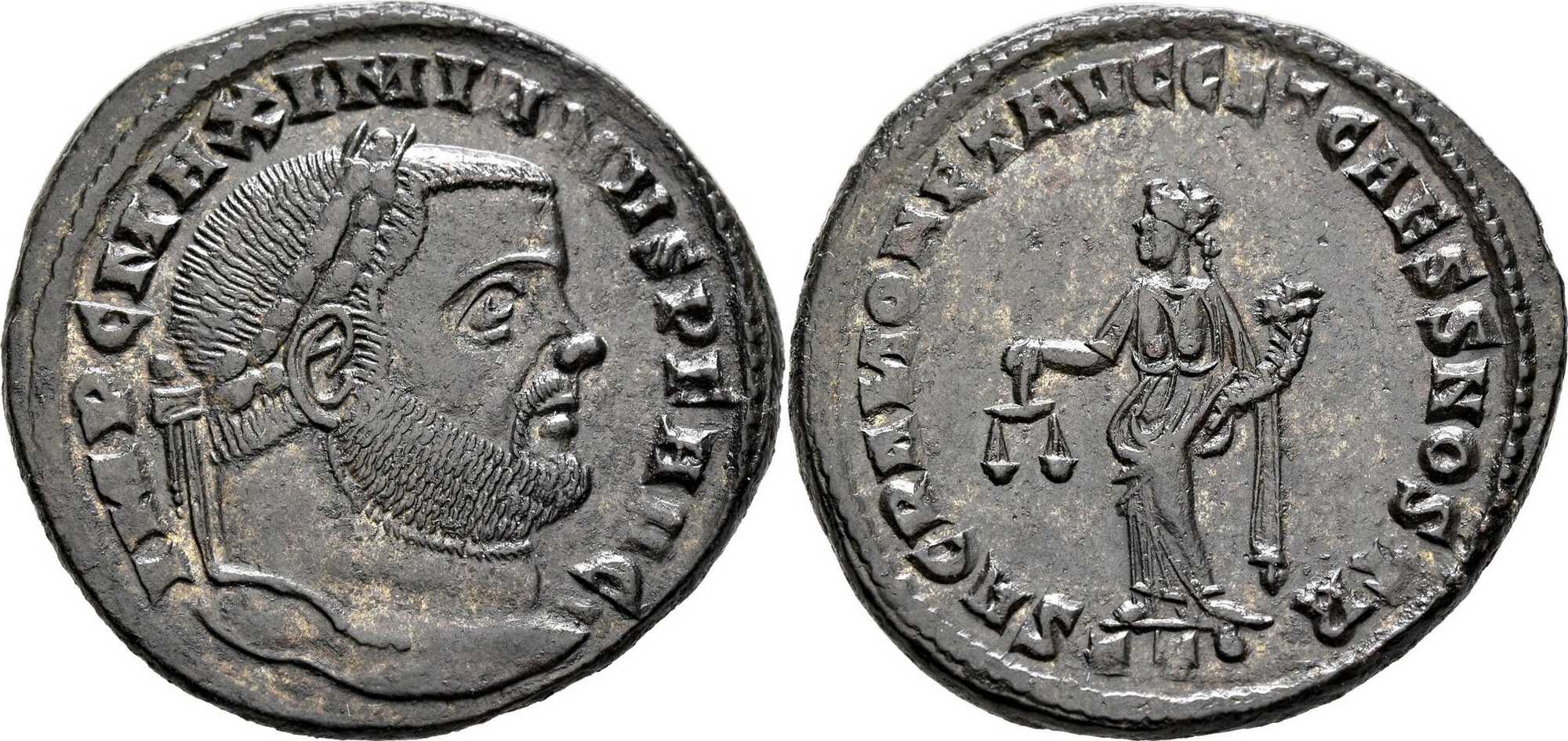 IMPCMAXIMIANVSPFAVG [IMP C MAXIMIANVS P F AVG]; head r., laur., with drapery on l. shoulder.