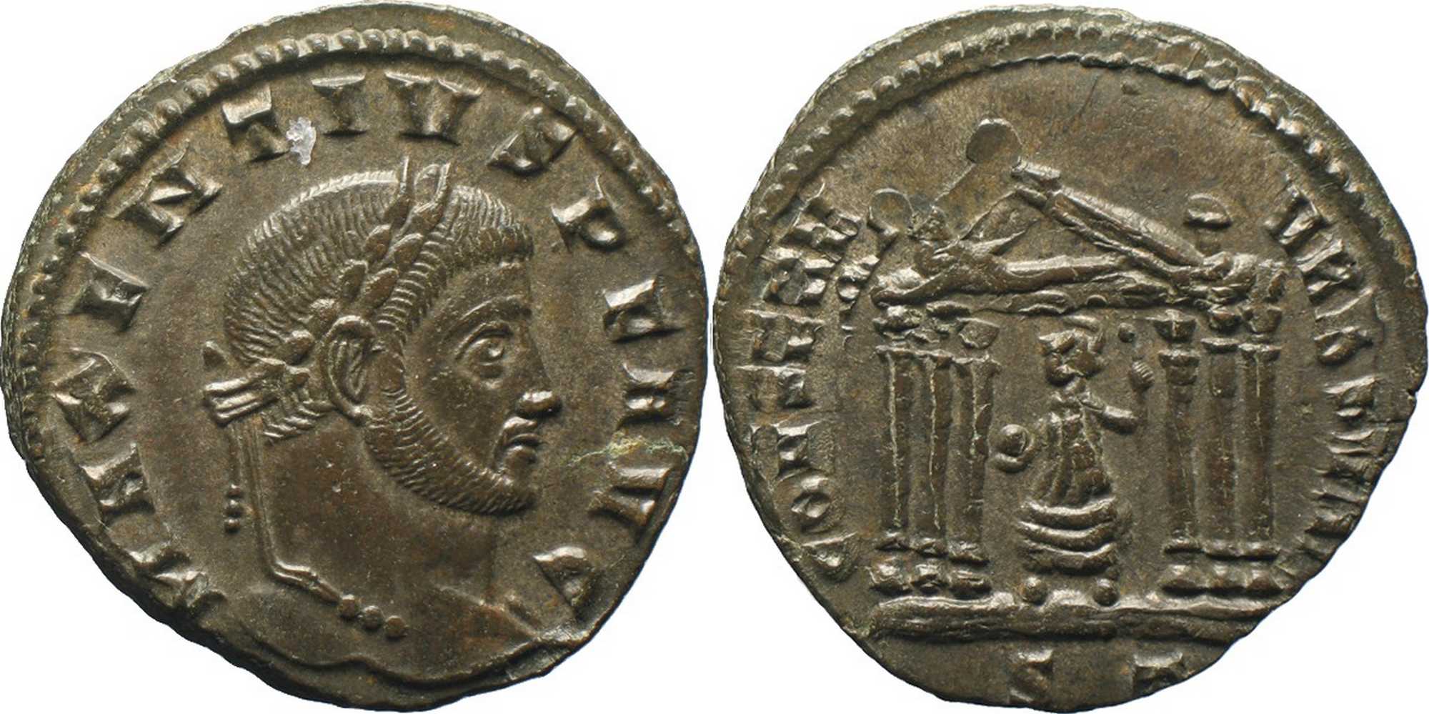 MAXENTIVSPFAVG [MAXENTIVS P F AVG]; head r., laur., with drapery on l. shoulder.