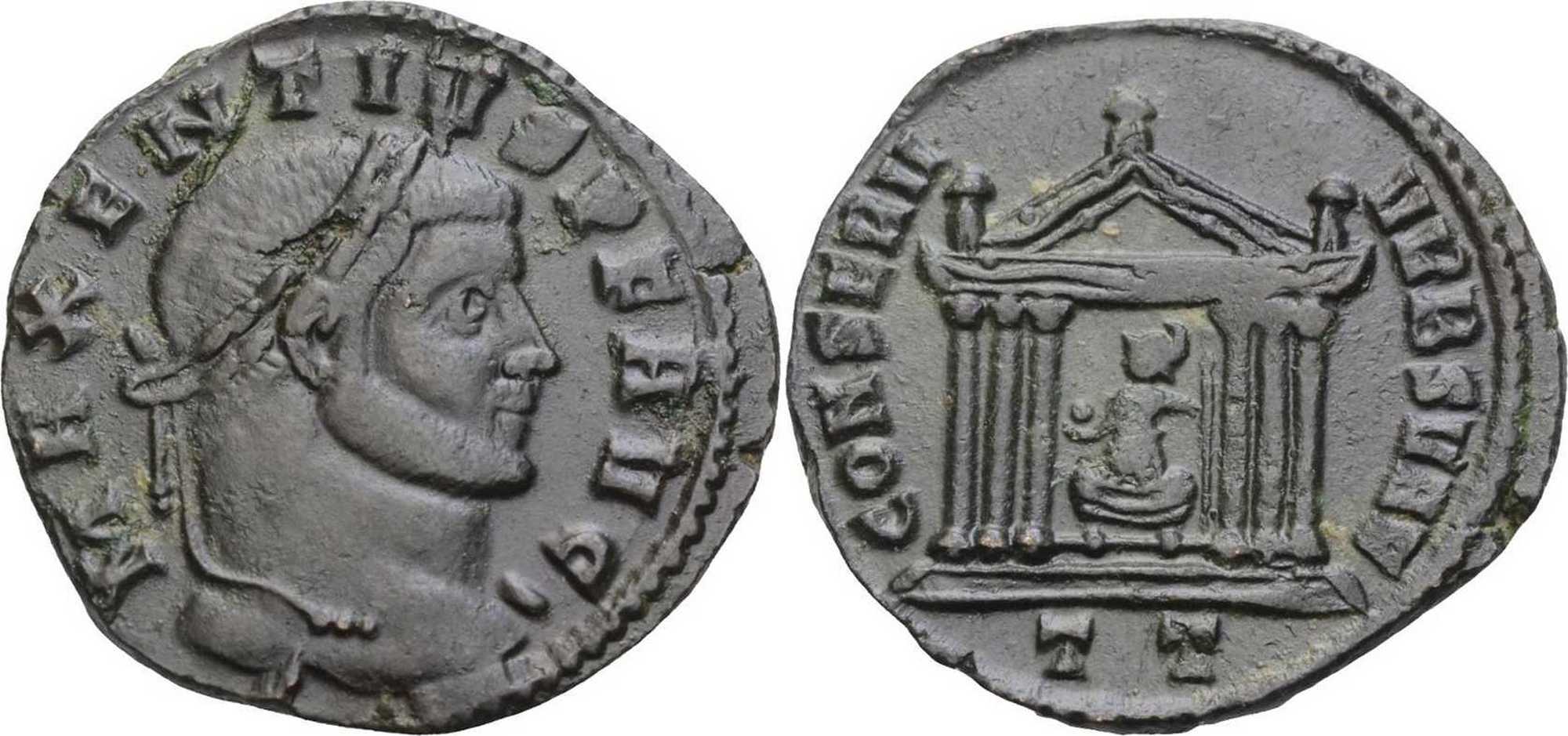 CONSERV-VRBSVAE [CONSERV VRB SVAE]; Roma std. facing, head l., in hexastyle temple, r. holding globe, l. sceptre; knobs as acroteria; pediment empty. TT in exergue.