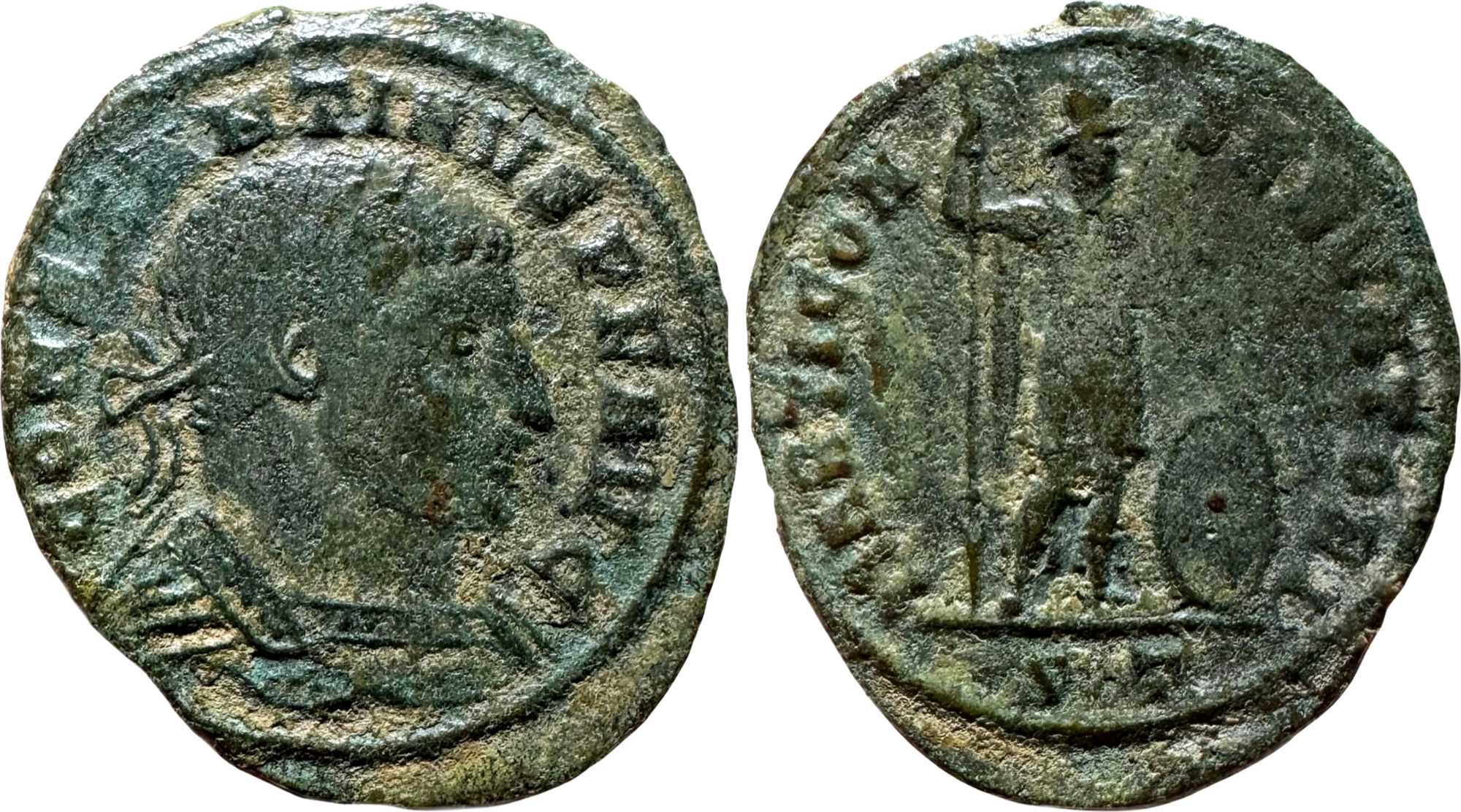 REVERSE VARIETY. Specimen similar to TICINUM 124a except for Mars stg. facing, head facing instead of Mars stg. r. At first glance, the description in RIC seems to be correct: "Mars stg. facing". However, it is unclear what Sutherland means by "stg. facing", because he sometimes uses this phrase when "stg. r." would be more accurate (cf. LONDINIUM 279-287; OSTIA 83-92b). Note also description of similar reverse with Sol [TICINUM 133], where he uses another phrase: "stg. facing, head facing" and lists this variety as a separate issue.
