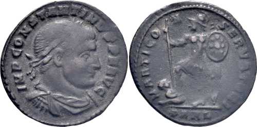 MARTICO-N-SERVATORI [MARTI CONSERVATORI]; Marst stg. l., vertical spear in r. hand, shield on l. arm, placing foot on captive on ground to l. PARL in exergue.