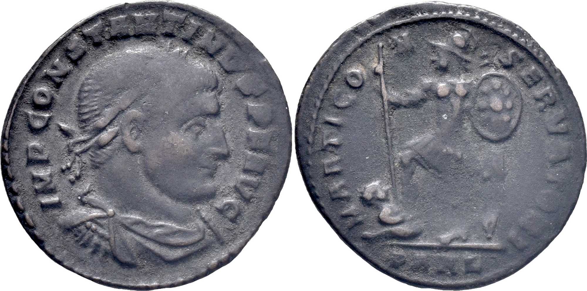 IMPCONSTANTINVSPFAVG [IMP CONSTANTINVS P F AVG]; bust r., laur., dr., cuir. [B4].