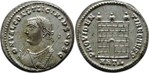 PROVIDEN-TIAECAESS [PROVIDENTIAE CAESS]; camp gate with three turrets, no doors; varying number of stone layers. MHTΔ in exergue.