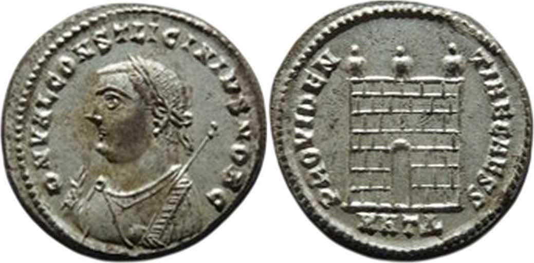 DNVALCONSTLICINIVSNOBC [D N VAL CONST LICINIVS NOB C]; bust l., laur., dr., globe, sceptre in l. hand, mappa in r. hand.