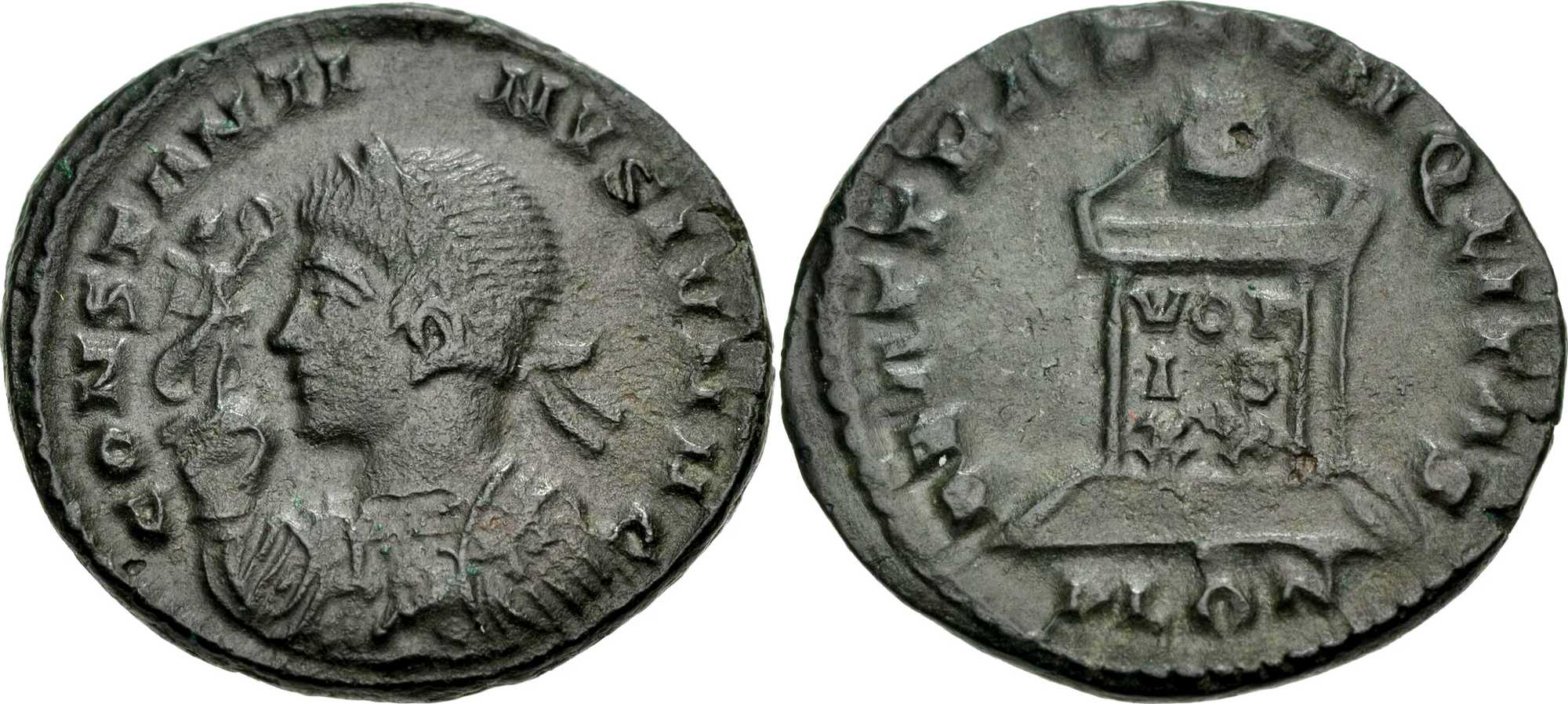 - from the Late Roman Bronze Coin Forum; posted by Victor; weight 3.70 g; diameter 18-19 mm; bust could be regarded as trabeate [click for picture];