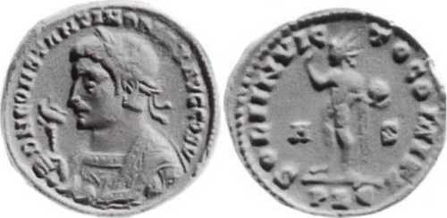 SOLIINVIC-TOCOMITI [SOLI INVICTO COMITI]; Sol stg. l., chlamys across l. shoulder, raising r. hand, globe in l. hand. A in left field, S in right field. PLG in exergue.