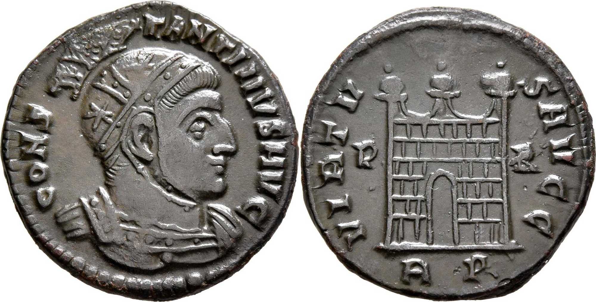 CONS-TANTINVSAVG [CONSTANTINVS AVG]; bust r., high-crested helmet (bowl-shaped), cuir.
