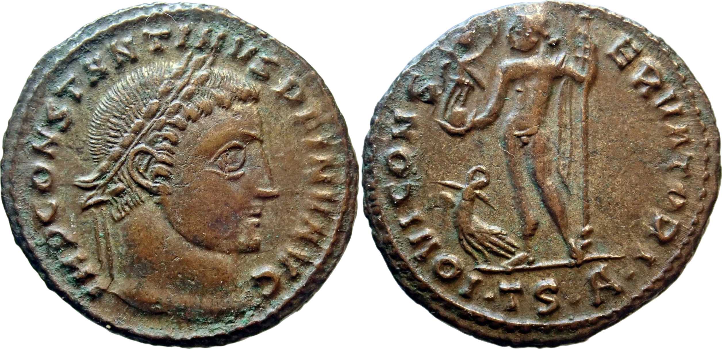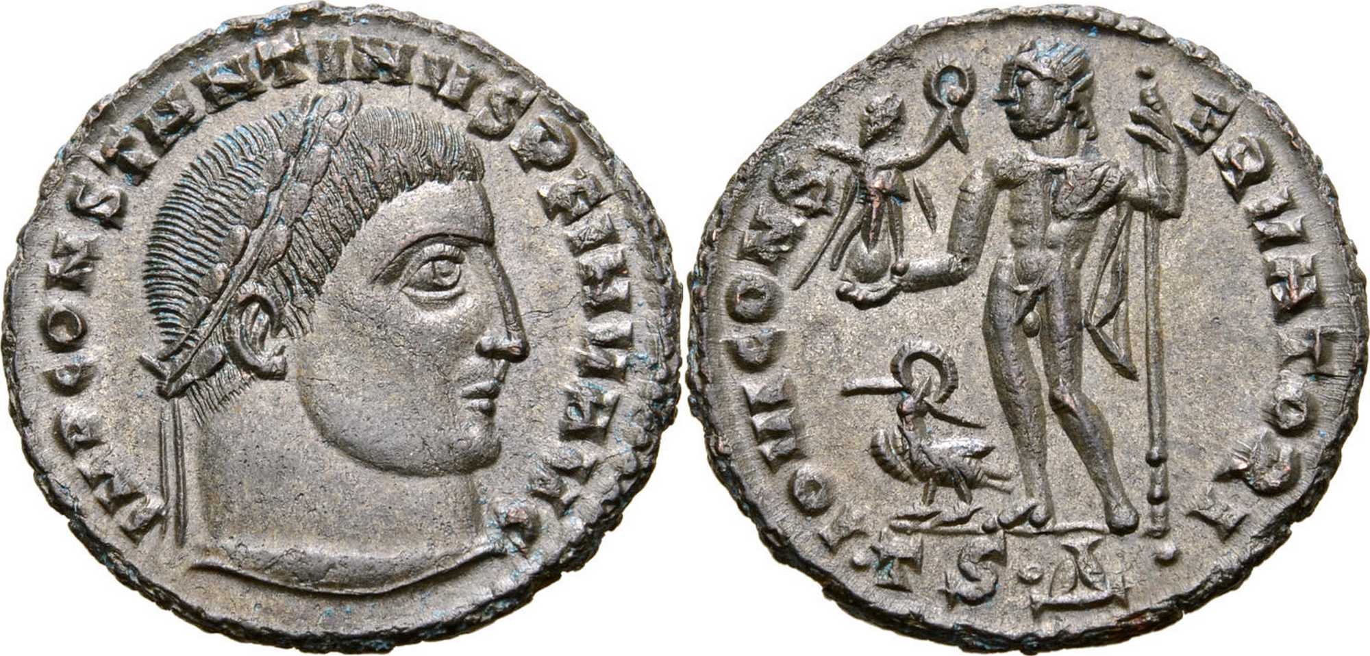 OBVERSE LEGEND VARIETY. Specimen similar to THESSALONICA 4 except for CONSTSNTINVS instead of CONSTANTINVS. Apparently an engraver's error.