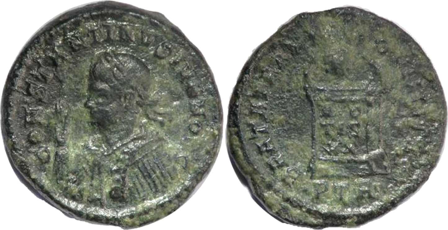 CONSTANTINVSIVNNOBC [CONSTANTINVS IVN NOB C]; bust l., laur., dr., cuir., raising r. hand [L1 l.].