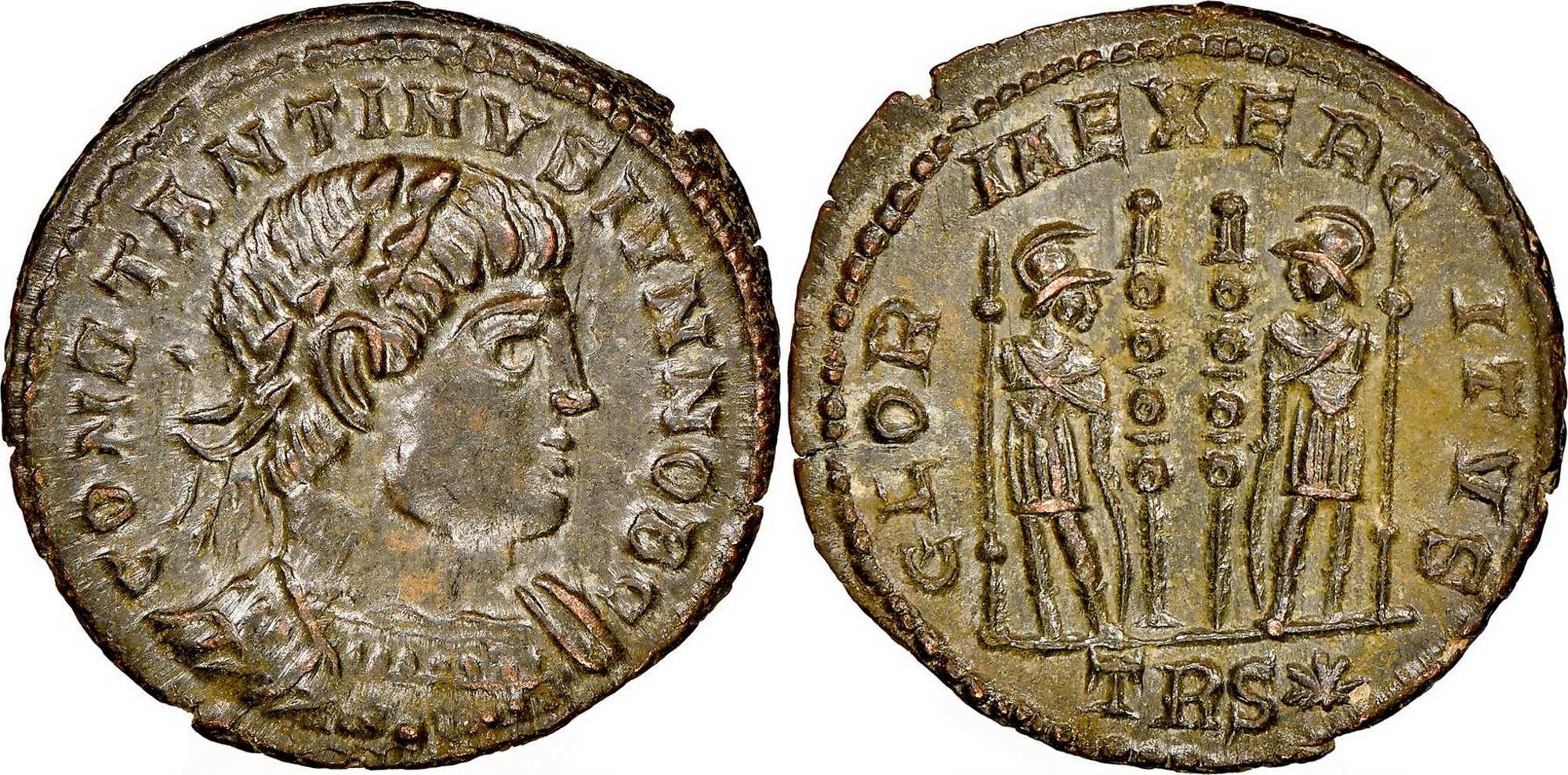 LONDON 17. According to RIC, this type with bust H2 l. and obv. legend 1g (CONSTANTINVS AVG) is illustarted as no. 17 on plate 1. Actually, the picture on plate 1 shows coin with bust H2 l. and obv. legend 1e (CONSTANTINVS P F AVG), i.e. LONDON 14 [Thanks to the collaboration of Leszek Wąsik].