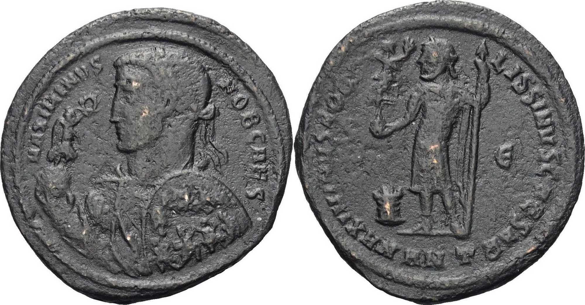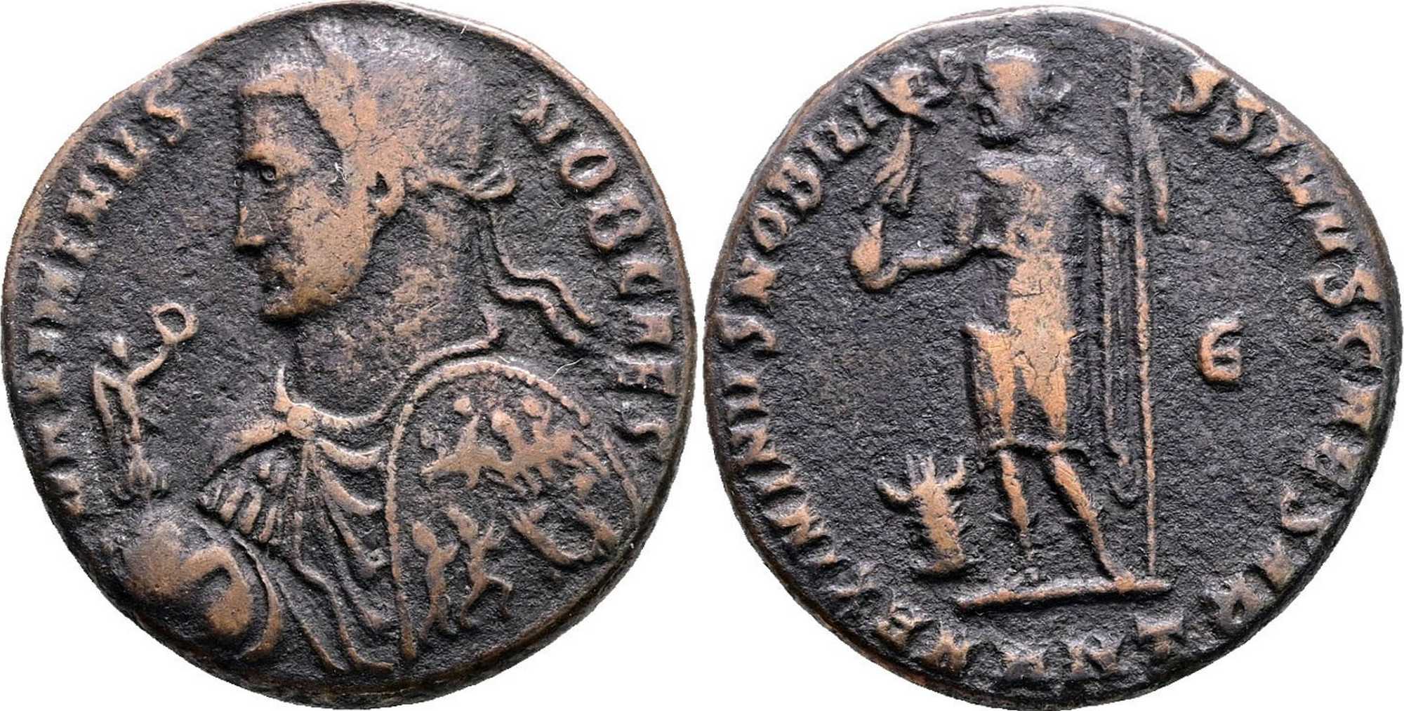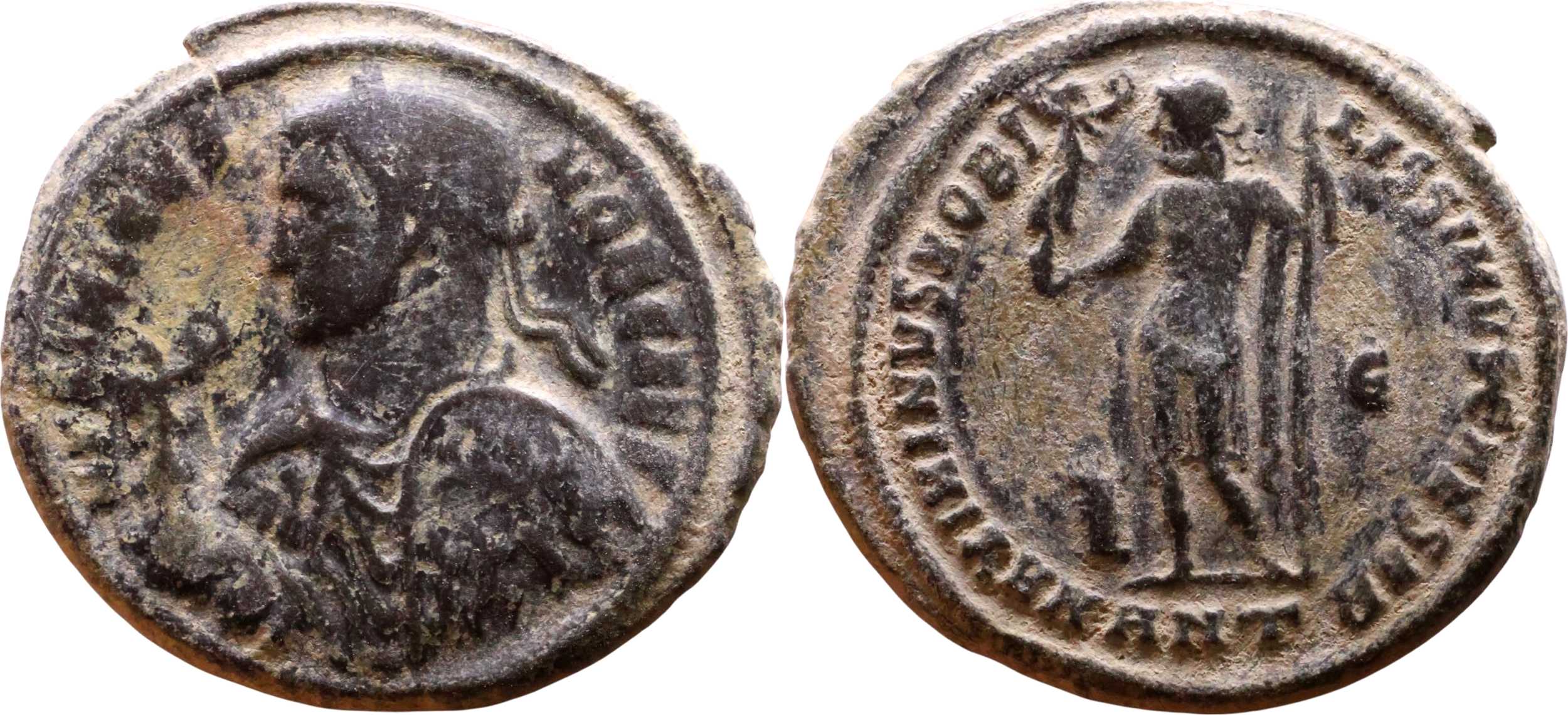 MAXIMINVSNOBI-LISSIMVSCAESAR [MAXIMINVS NOBILISSIMVS CAESAR]; Maximinus stg. facing, head l., in military dress, r. holding Victory on globe, l. leaning on spear. Altar in left field, Є in right field. ANT in exergue.