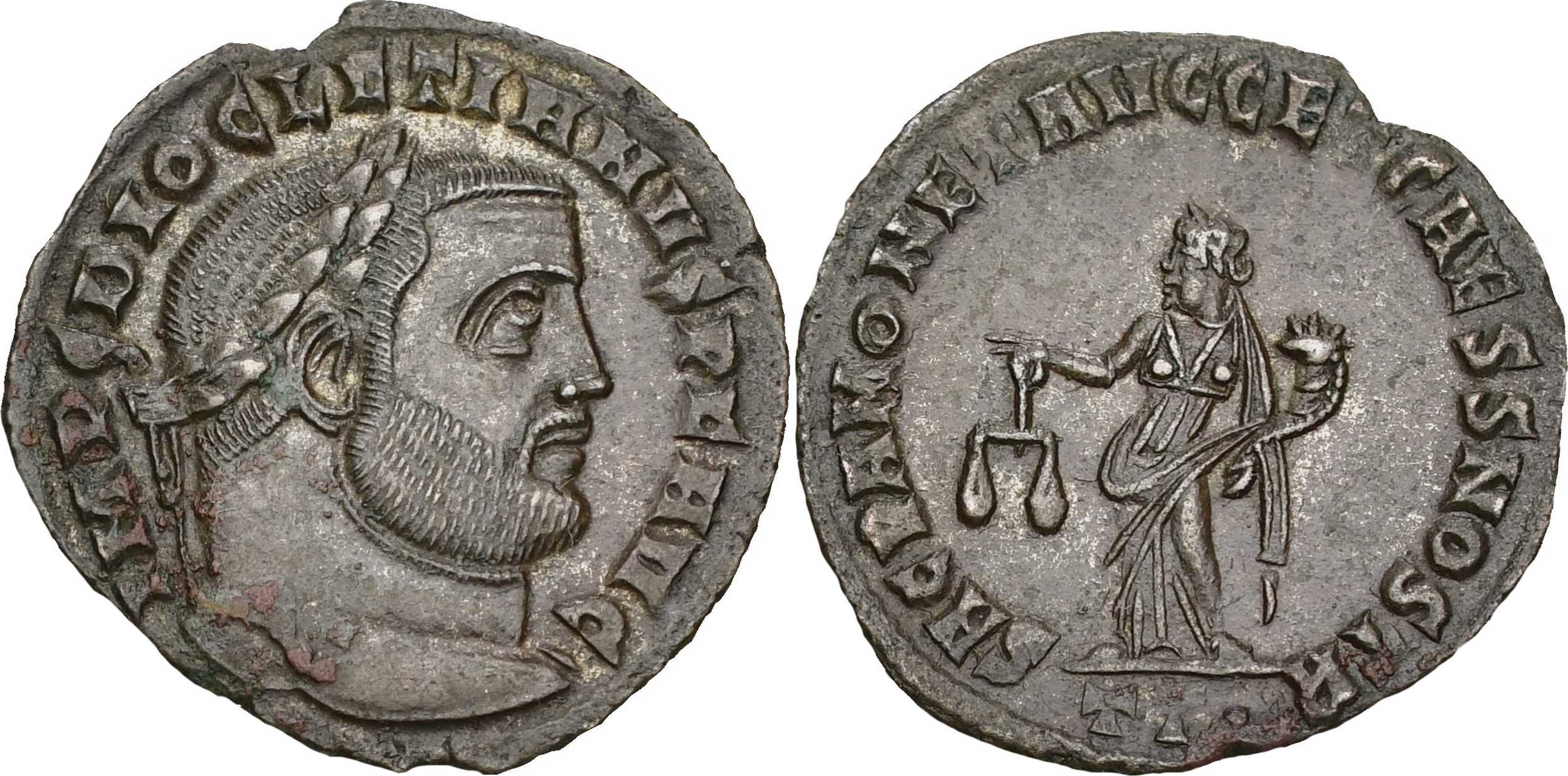 SACRAMONETAVGGETCAESSNOSTR [SACRA MONET AVGG ET CAESS NOSTR]; Moneta stg. l., r. holding scales, l, cornucopiae. TT in exergue.