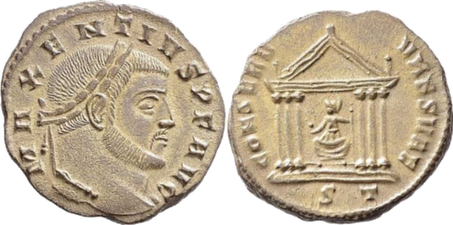 MAXENTIVSPFAVG [MAXENTIVS P F AVG]; head r., laur., with drapery on l. shoulder.