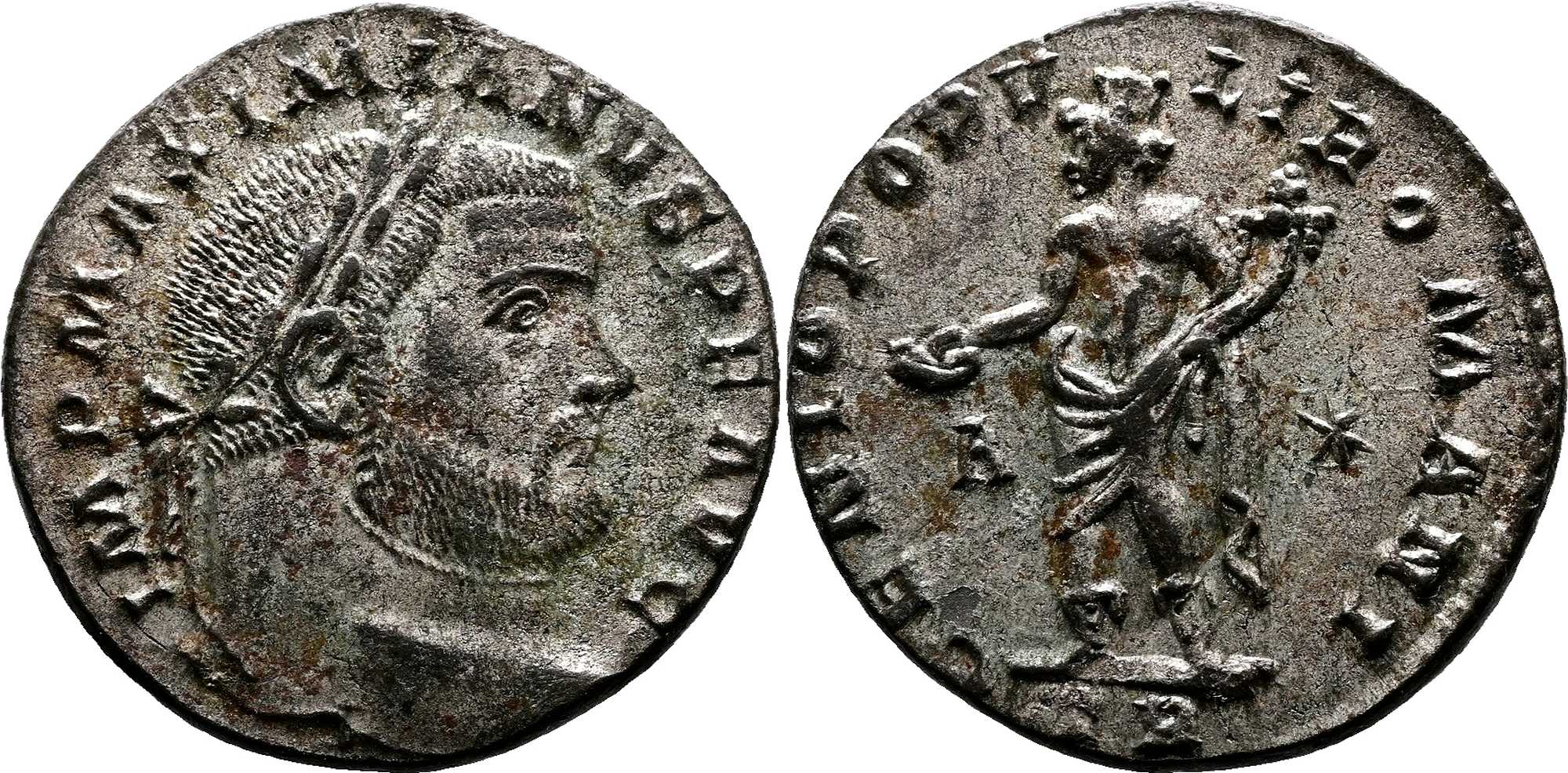 IMPMAXIMIANVSPFAVG [IMP MAXIMIANVS P F AVG]; head r., laur.