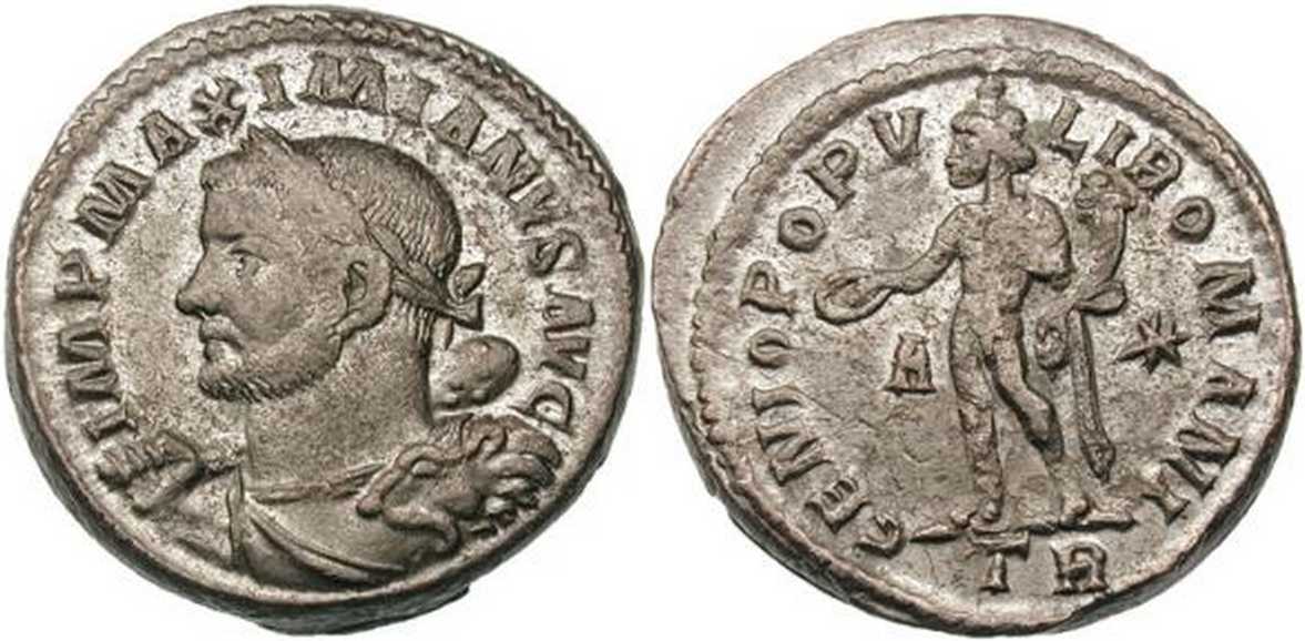 IMPMAXIMIANVSAVG [IMP MAXIMIANVS AVG]; bust l., laur., dr., r. holding club over shoulder, lion's skin on l. shoulder.