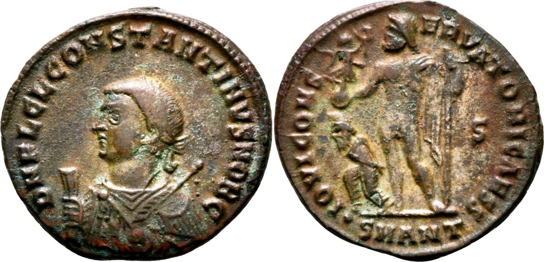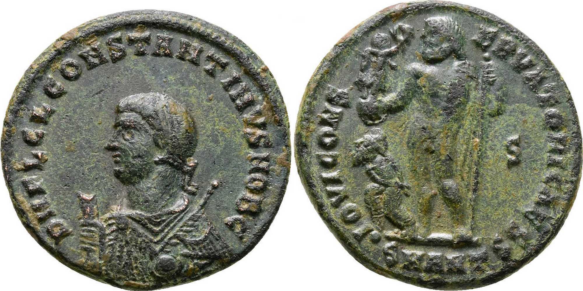 DNFLCLCONSTANTINVSNOBC [D N FL CL CONSTANTINVS NOB C]; bust l., laur., dr., globe, sceptre in l. hand, mappa in r. hand.