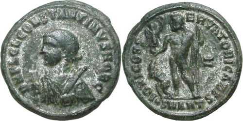 MINTMARK VARIETY. Specimen similar to ANTIOCH 30 (officina Z not attested) except for the dot in m.m. (p. 680). Probably this type is descibed in footnote 26 on p. 680 as "with dot preceding rev. legend". Possibly an unlisted issue. Also, officina Z is not attested in RIC for ANTIOCH 30. Note, however, that this dot may be sometimes regarded as a part of captive's foot. Otherwise, coin should be listed before ANTIOCH 26.