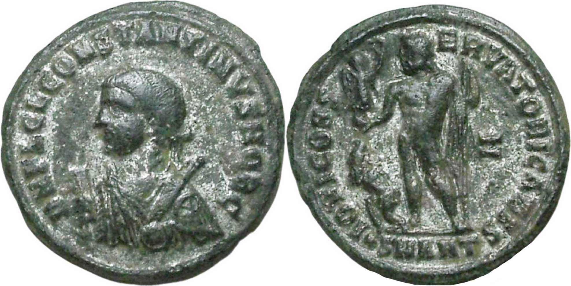 DNFLCLCONSTANTINVSNOBC [D N FL CL CONSTANTINVS NOB C]; bust l., laur., dr., globe, sceptre in l. hand, mappa in r. hand.