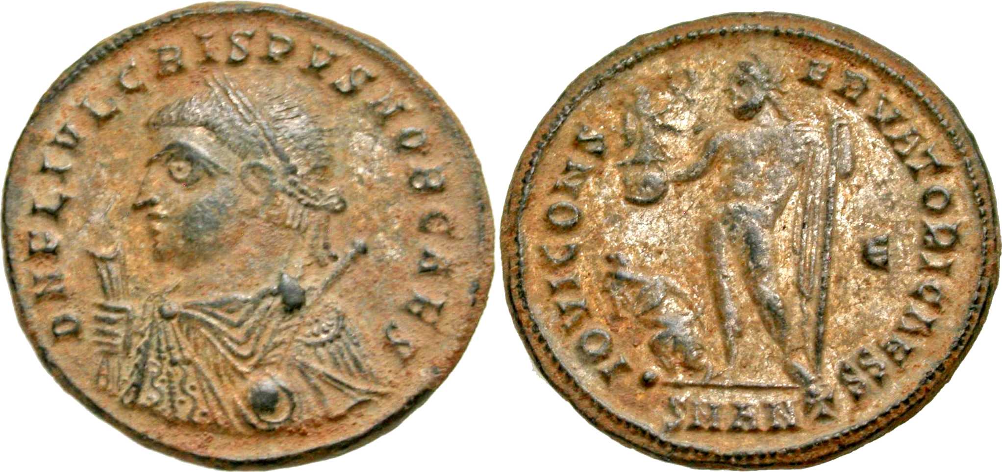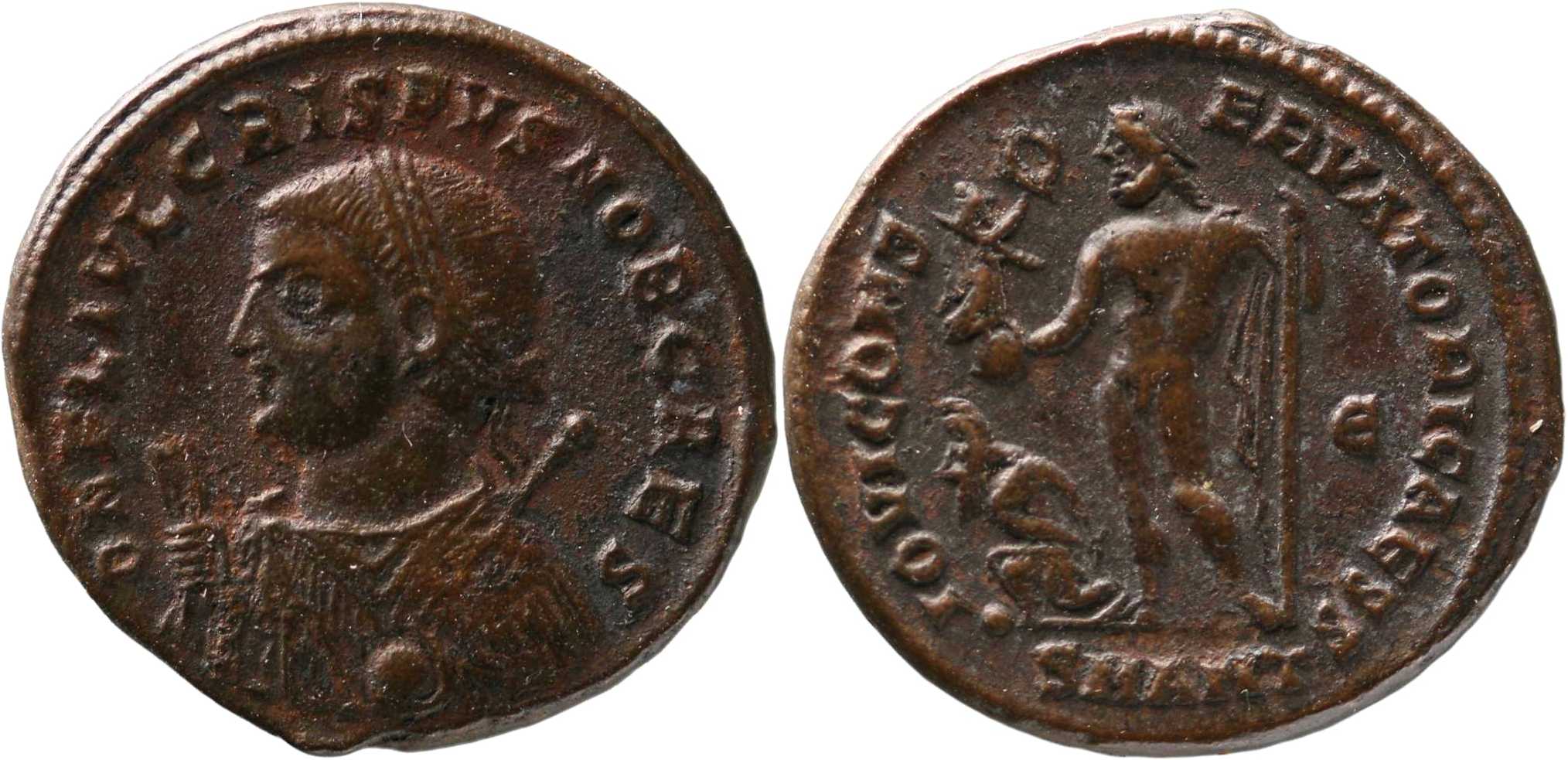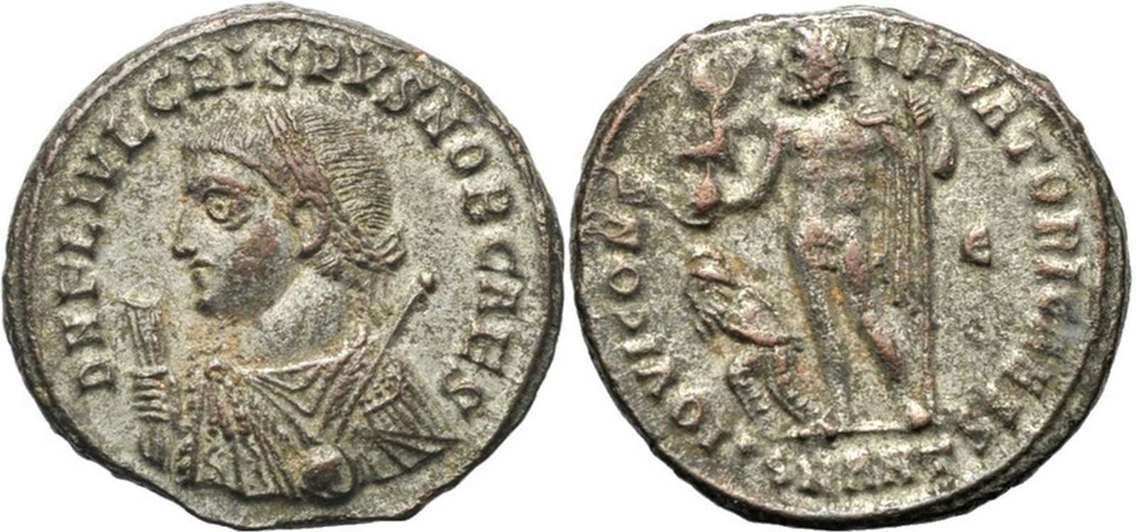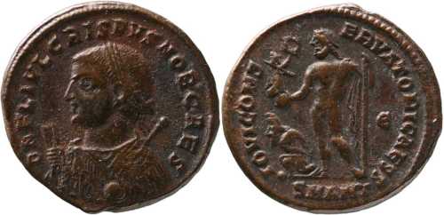 DNFLIVLCRISPVSNOBCAES [D N FL IVL CRISPVS NOB CAES]; bust l., laur., dr., globe, sceptre in l. hand, mappa in r. hand.