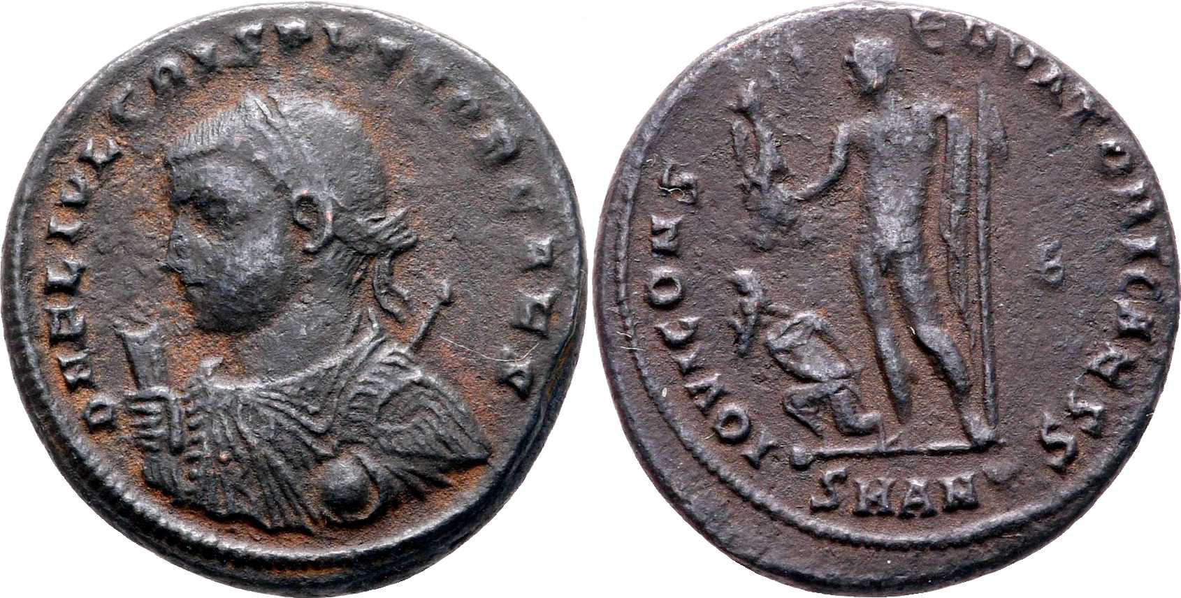 IOVICONS-ERVATORICAESS [IOVI CONSERVATORI CAESS]; Jupiter stg. l., chlamys across l. shoulder, leaning on sceptre, holding Victory on globe; to left captive. Є in right field. SMANT in exergue.