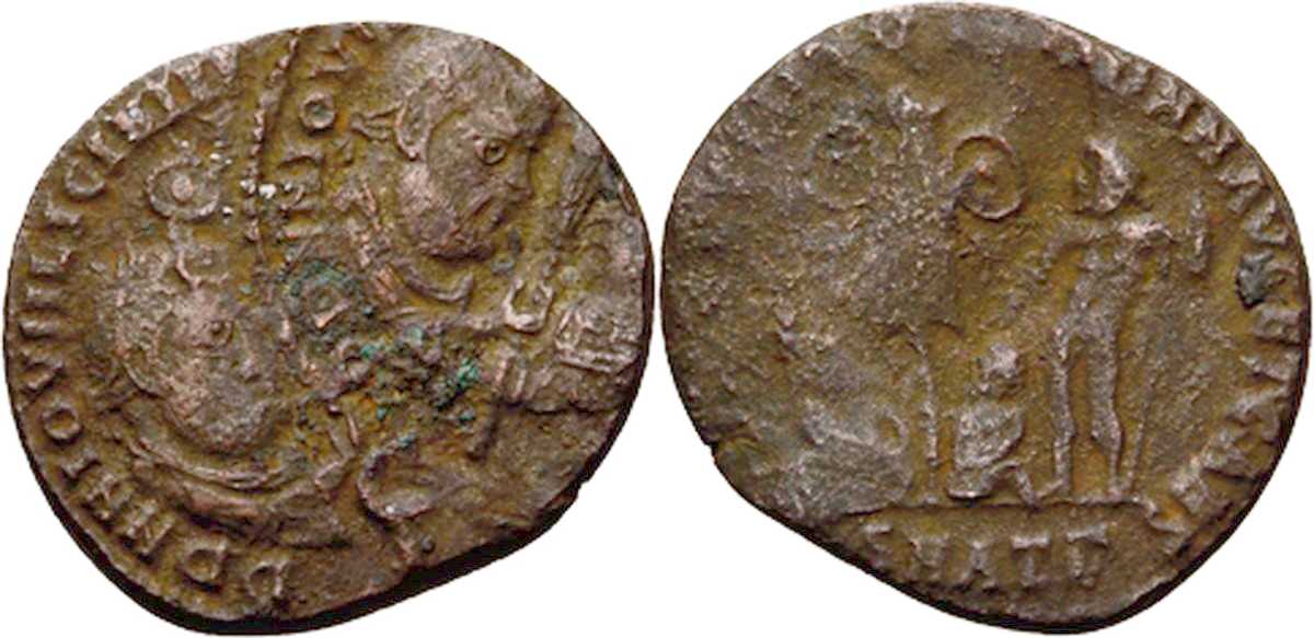 UNLISTED ISSUE. RIC erroneously lists this issue as HERACLEA 50; only officina A recorded (p. 547). Pierre Bastien in his article ["Coins with a Double Effigy Issued by Licinius at Nicomedia, Cyzicus, and Antioch", Numismatic Chronicle 1973, pp. 87-97, plate 5-6] suggested correct attribution and recorded specimens for eight officinae. His description of the obverse is slightly different: "laureate bust r. with cuirass and paludamentum, three-quarter front view, of Licinius, and laureate bust l., with cuirass and paludamentum, three-quarter front view, of Licinius II. The Emperors hold a trophy, with cuirass, helmet, and two shields" (p. 91). Issue was minted probably in 318 and should be listed before ANTIOCH 34.