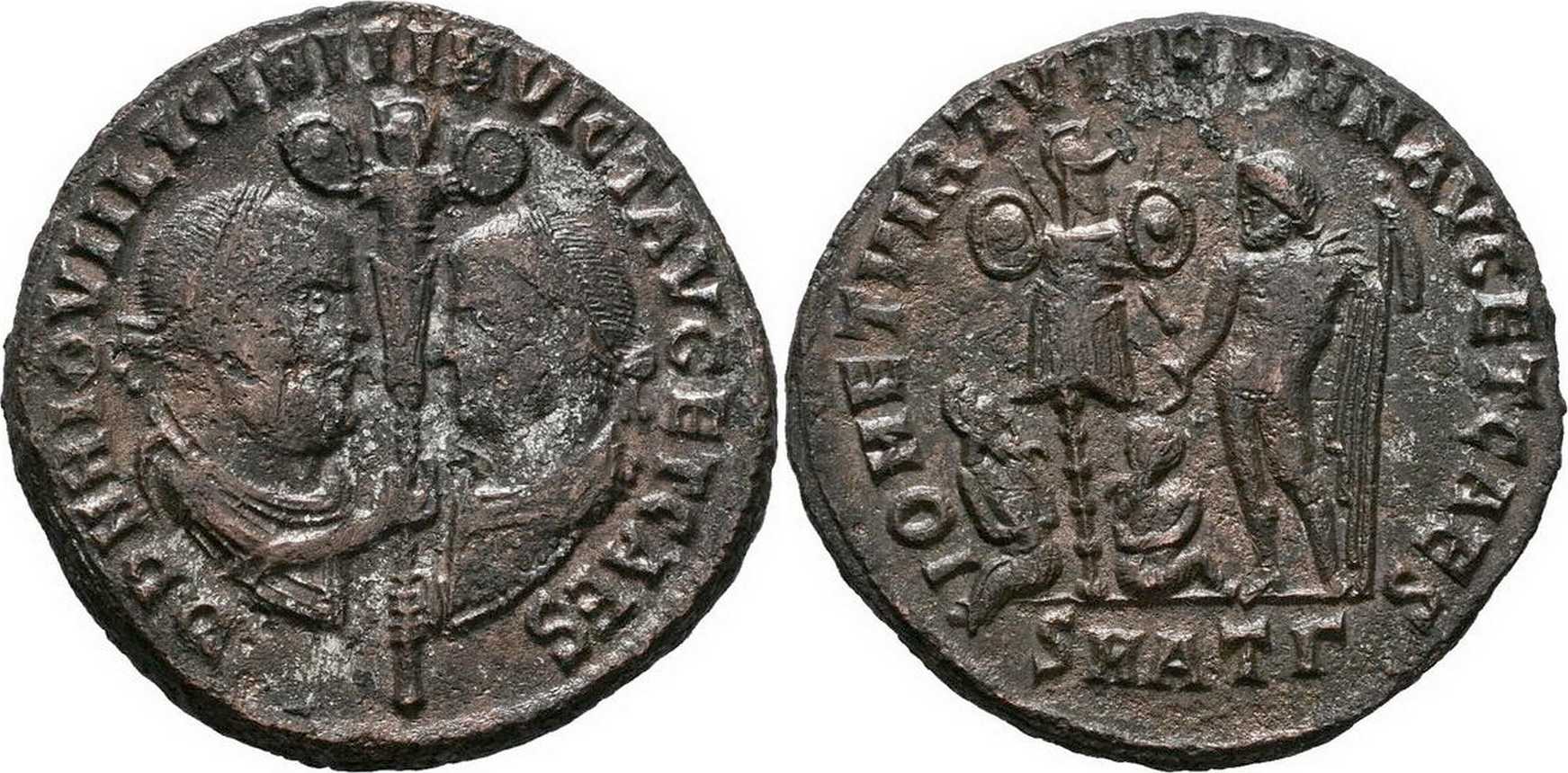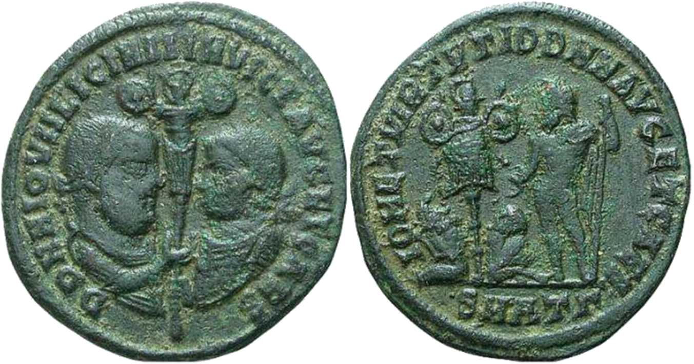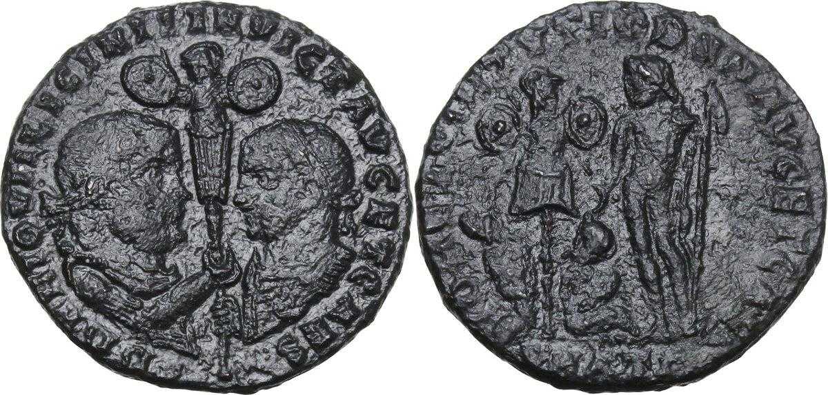DDNNIOVIILICINIIINVICTAVGETCAES [D D N N IOVII LICINII INVICT AVG ET CAES]; confronted busts, laur., dr., facing one another, together holding trophy with two shields [P3].
