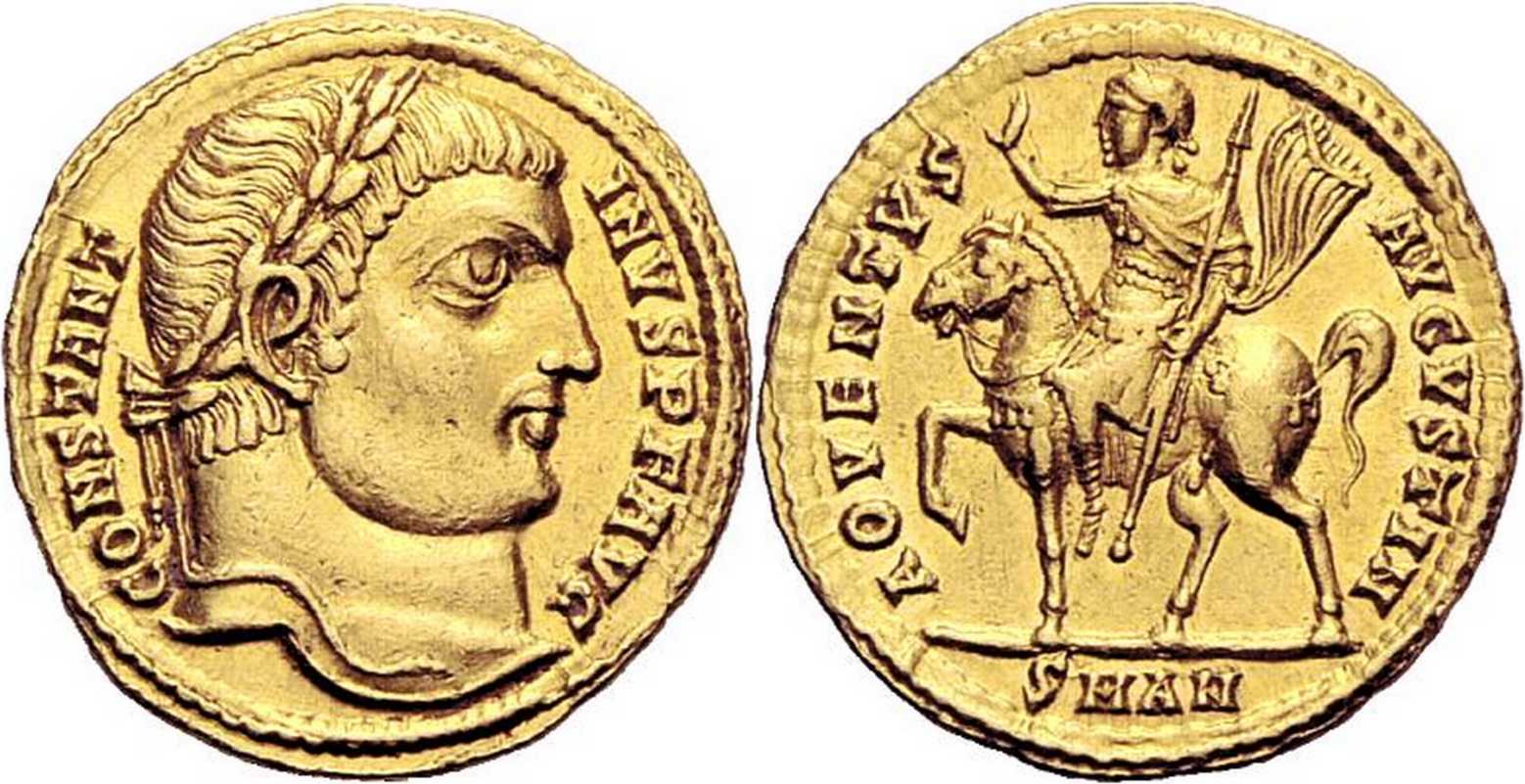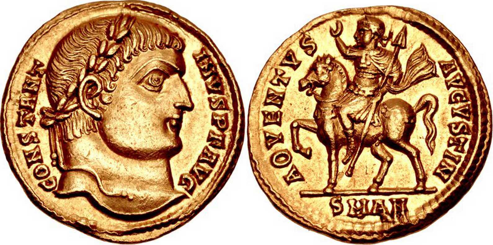 AOVENTVS-AVGVSTIN [AOVENTVS (sic!) AVGVSTI N]; Emperor mounted l., cloak flying, raising r. hand, holding spear in l. hand. SMAN in exergue.